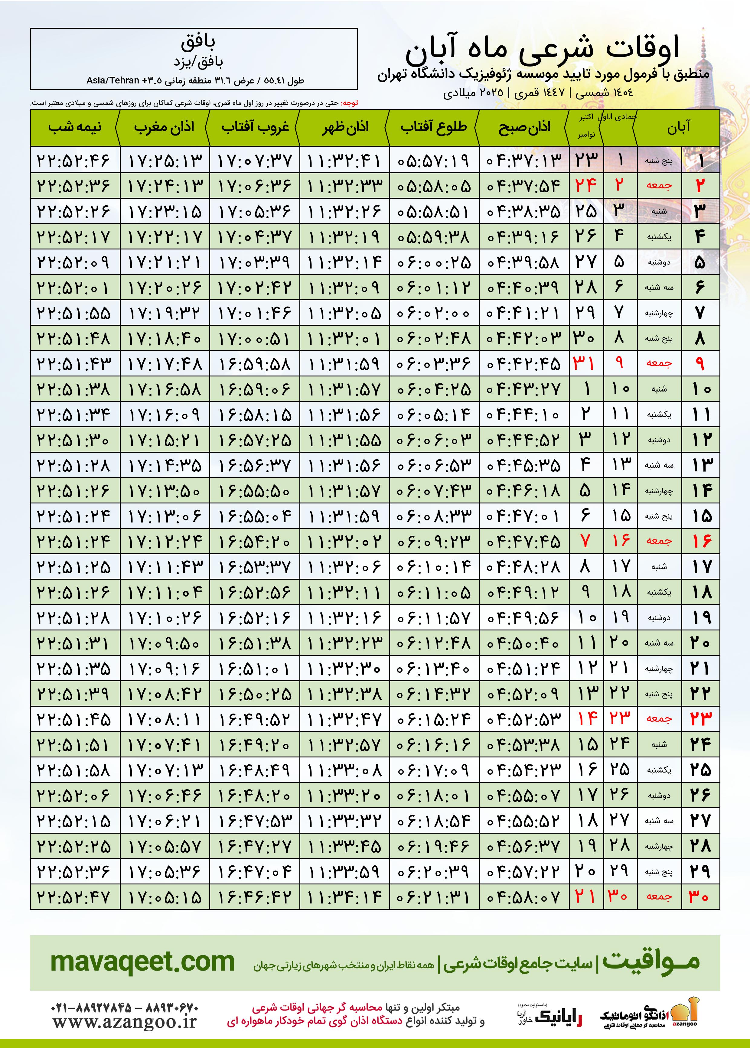 اوقات شرعی آبان ١٤٠٤ شمسی شهر بافق