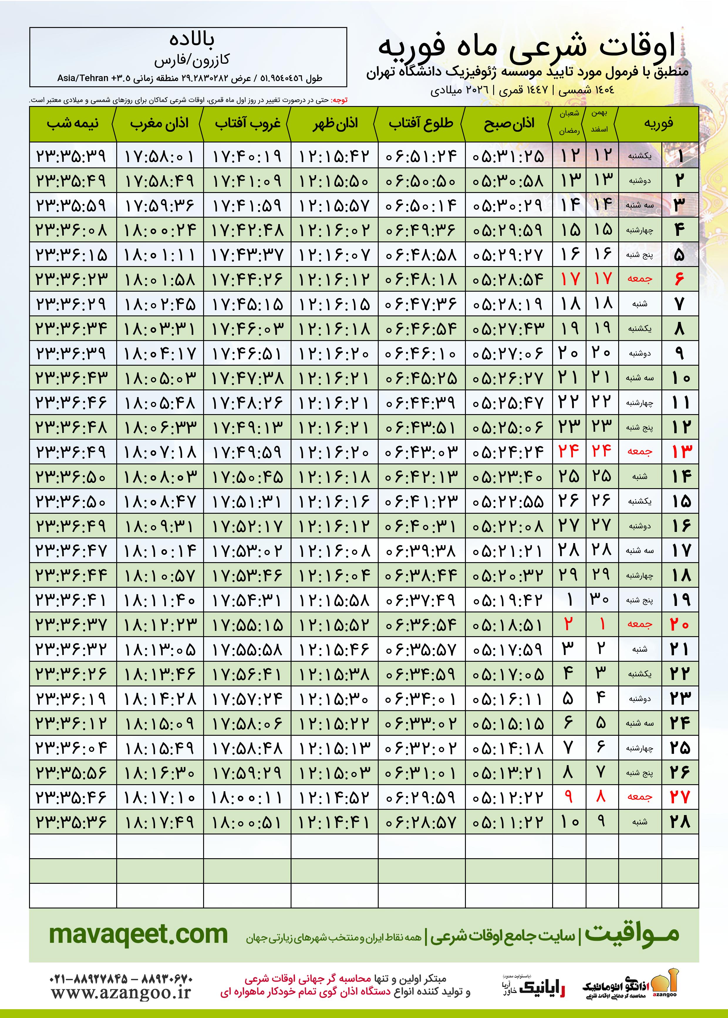 دانلود اوقات شرعی فوریه ٢٠٢٦ شهر بالاده