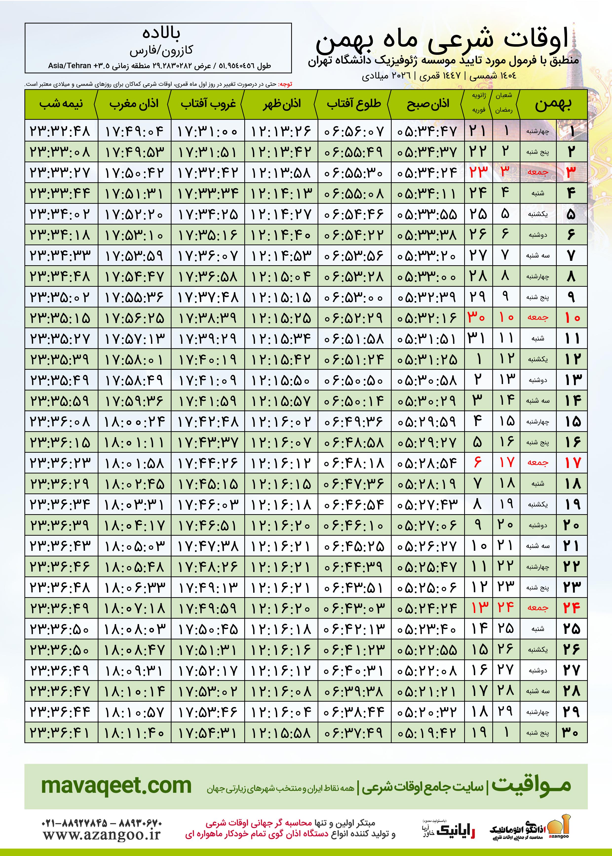 دانلود اوقات شرعی بهمن ٠٤ - ١٤٠٤ شهر بالاده