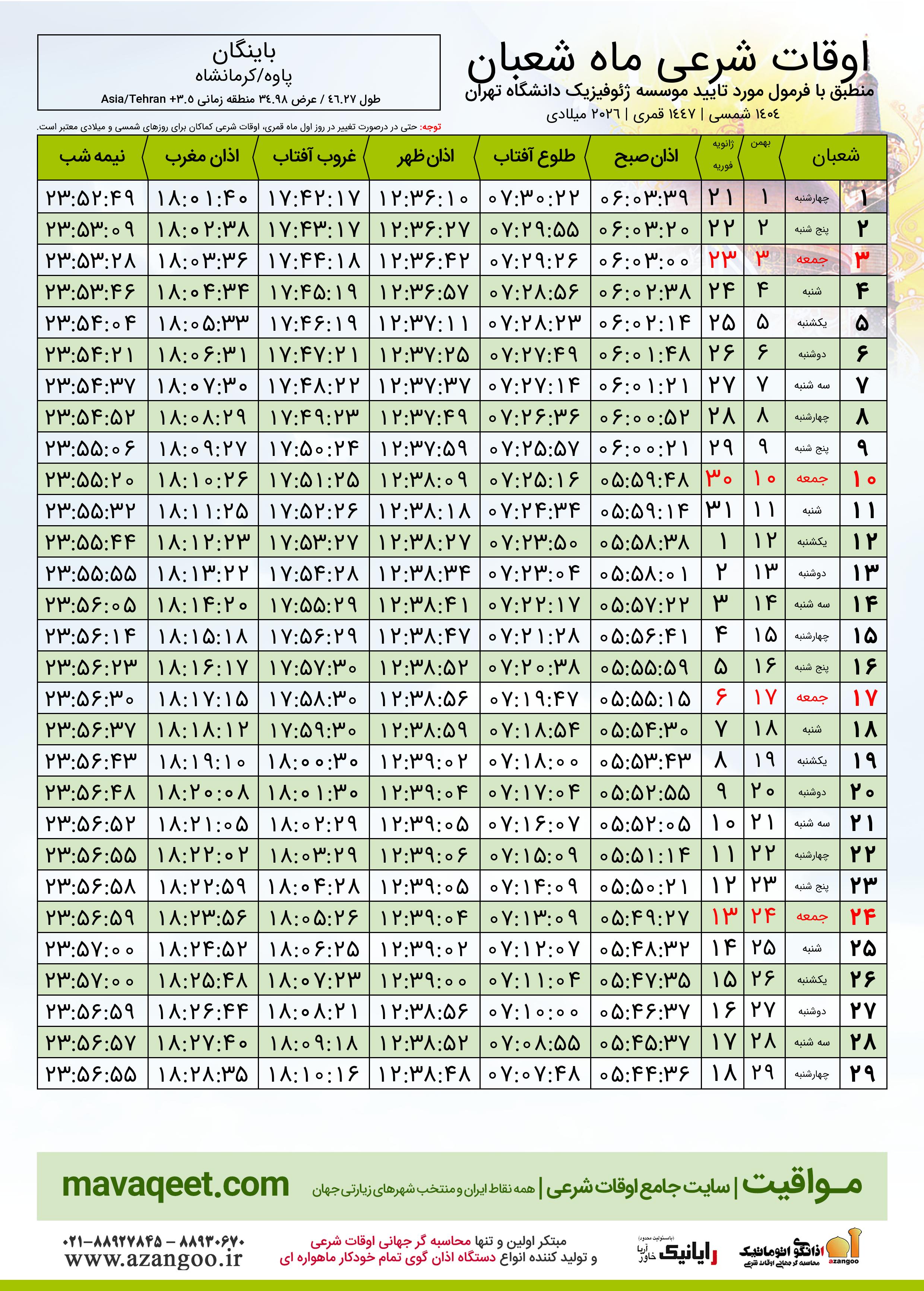 اوقات شرعی ماه شعبان ١٤٤٧ هـ.ق شهر باینگان بر
