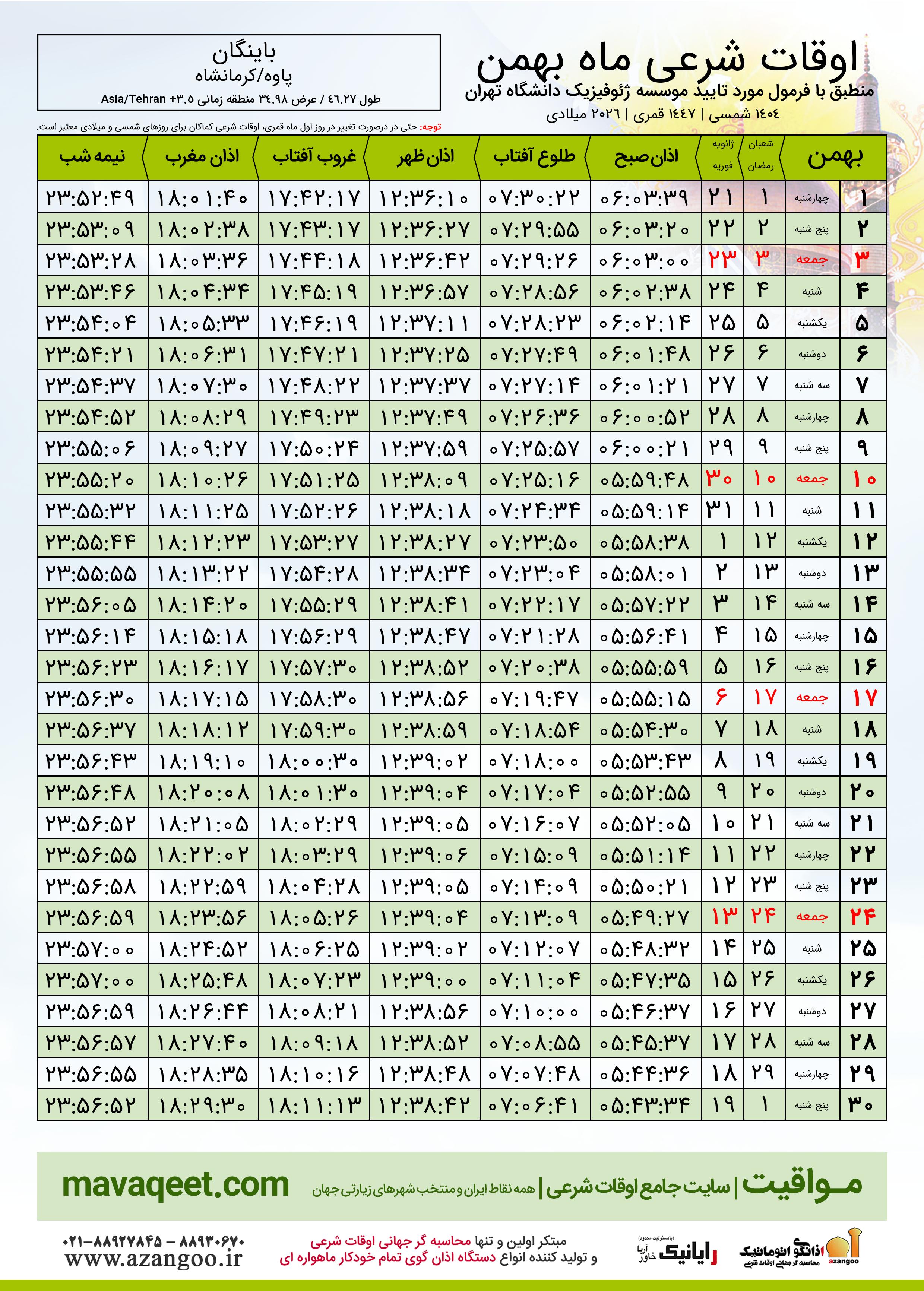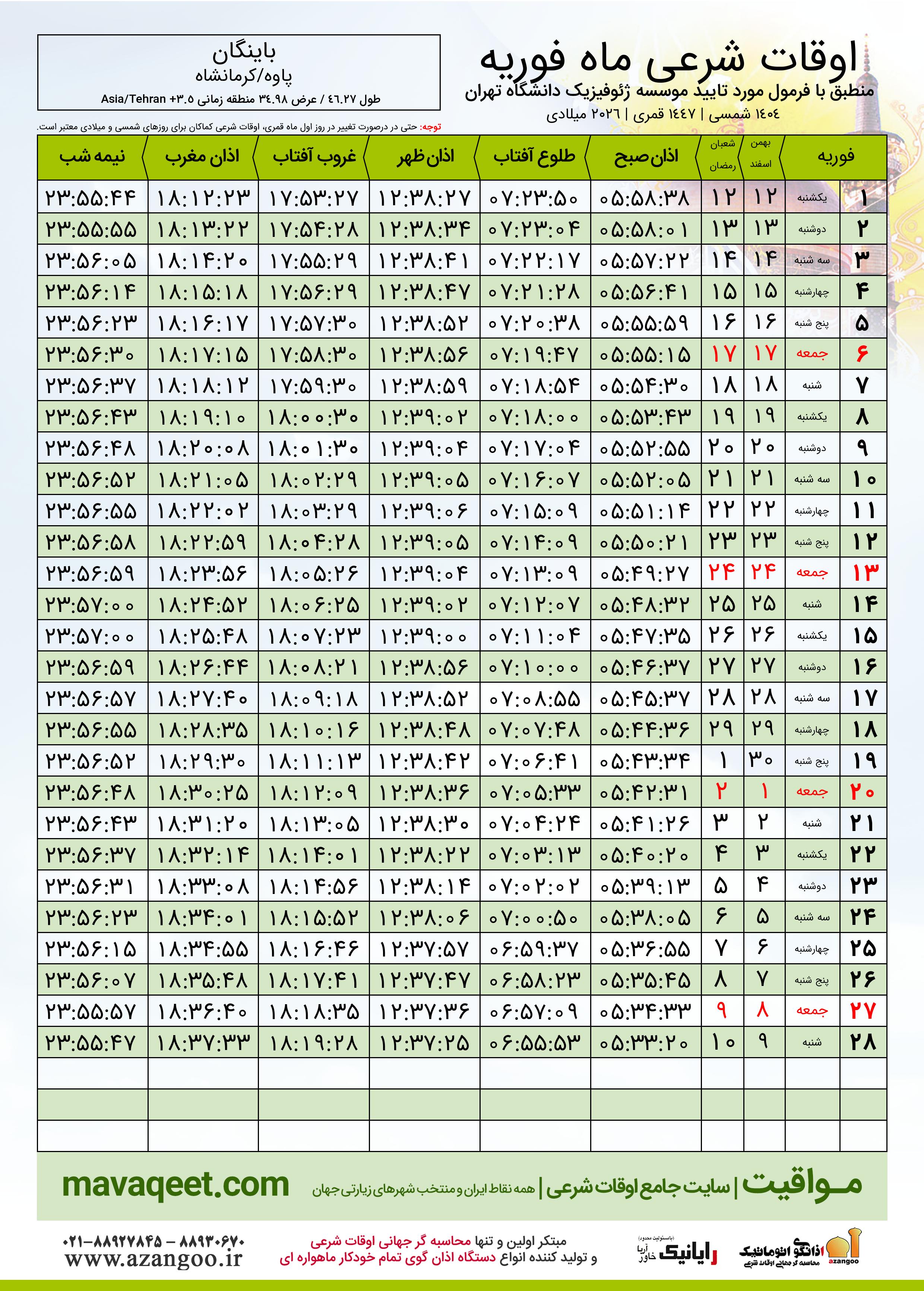 دانلود اوقات شرعی فوریه ٢٠٢٦ شهر باینگان