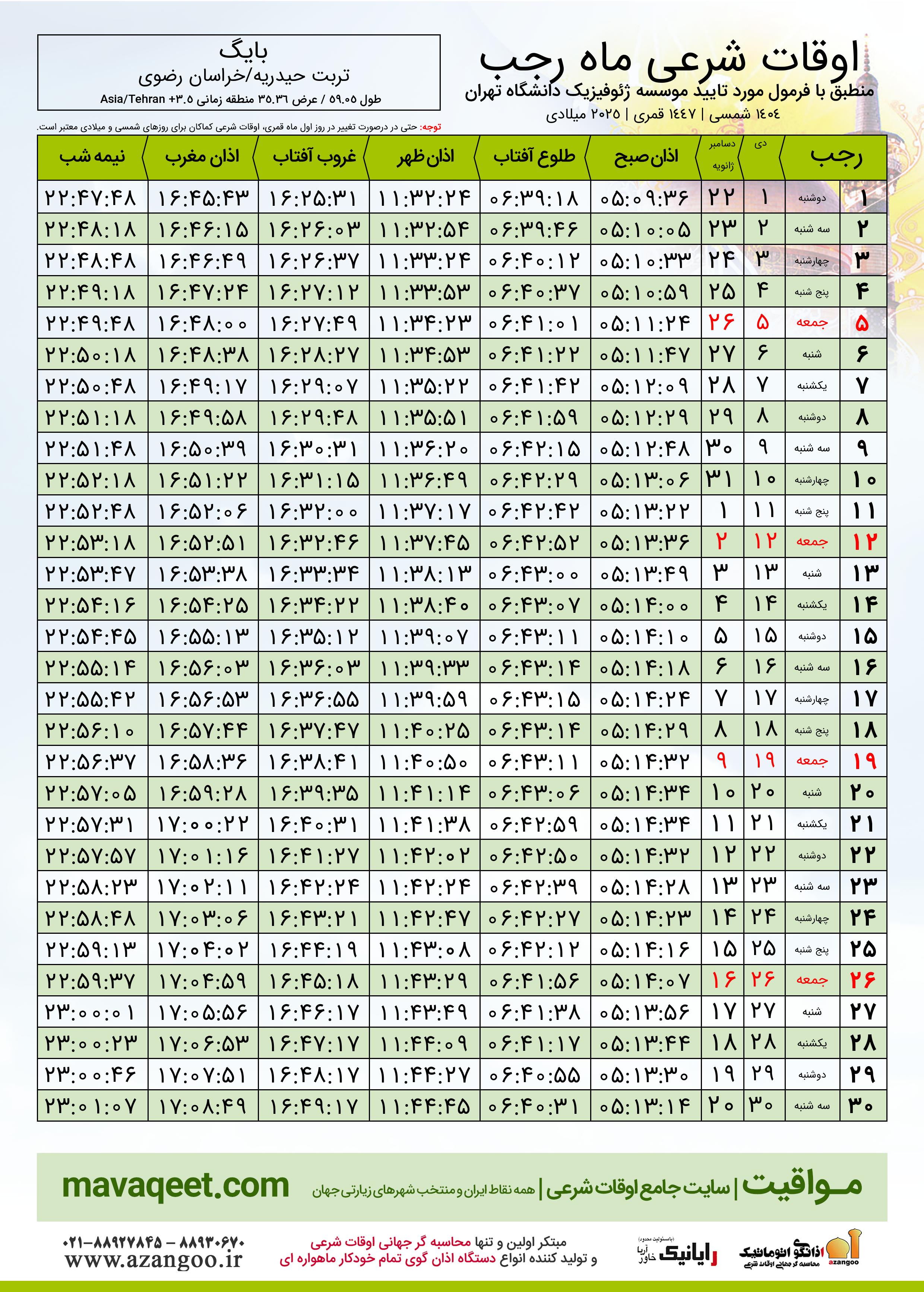 اوقات شرعی ماه رجب ١٤٤٧ هـ.ق شهر بایگ بر