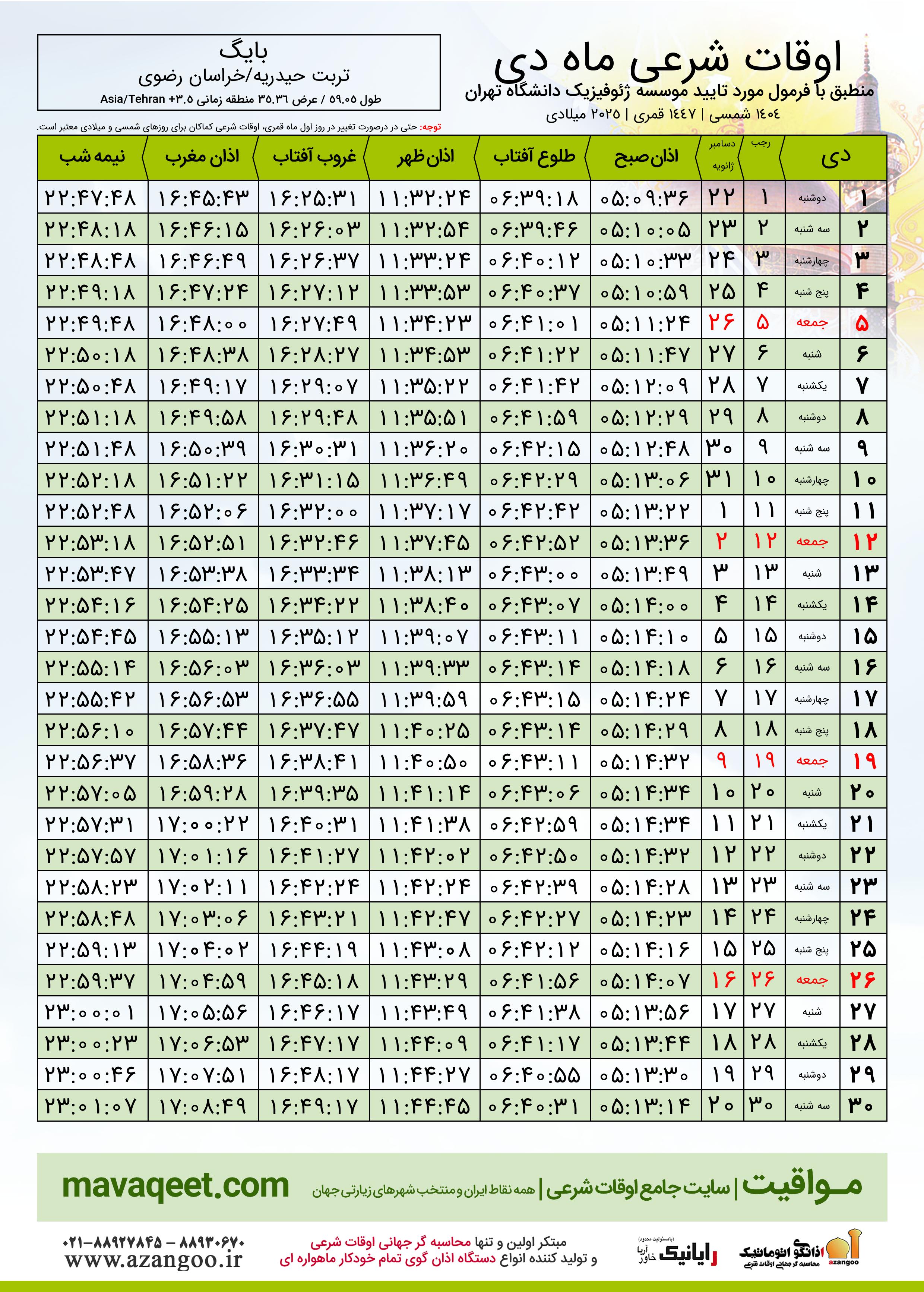 اوقات شرعی دی ١٤٠٤ شمسی شهر بایگ