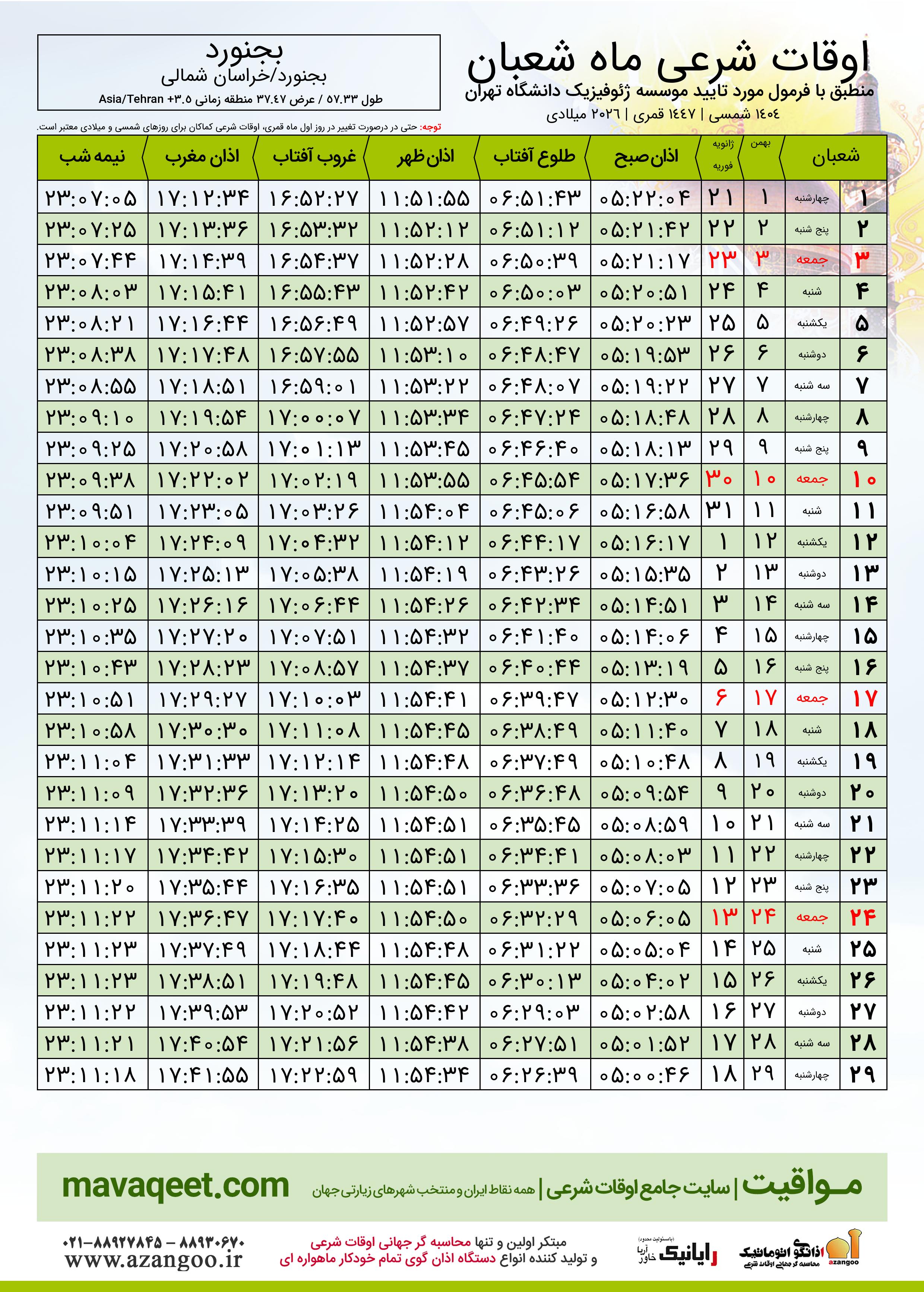 اوقات شرعی ماه شعبان ١٤٤٧ هـ.ق شهر بجنورد بر