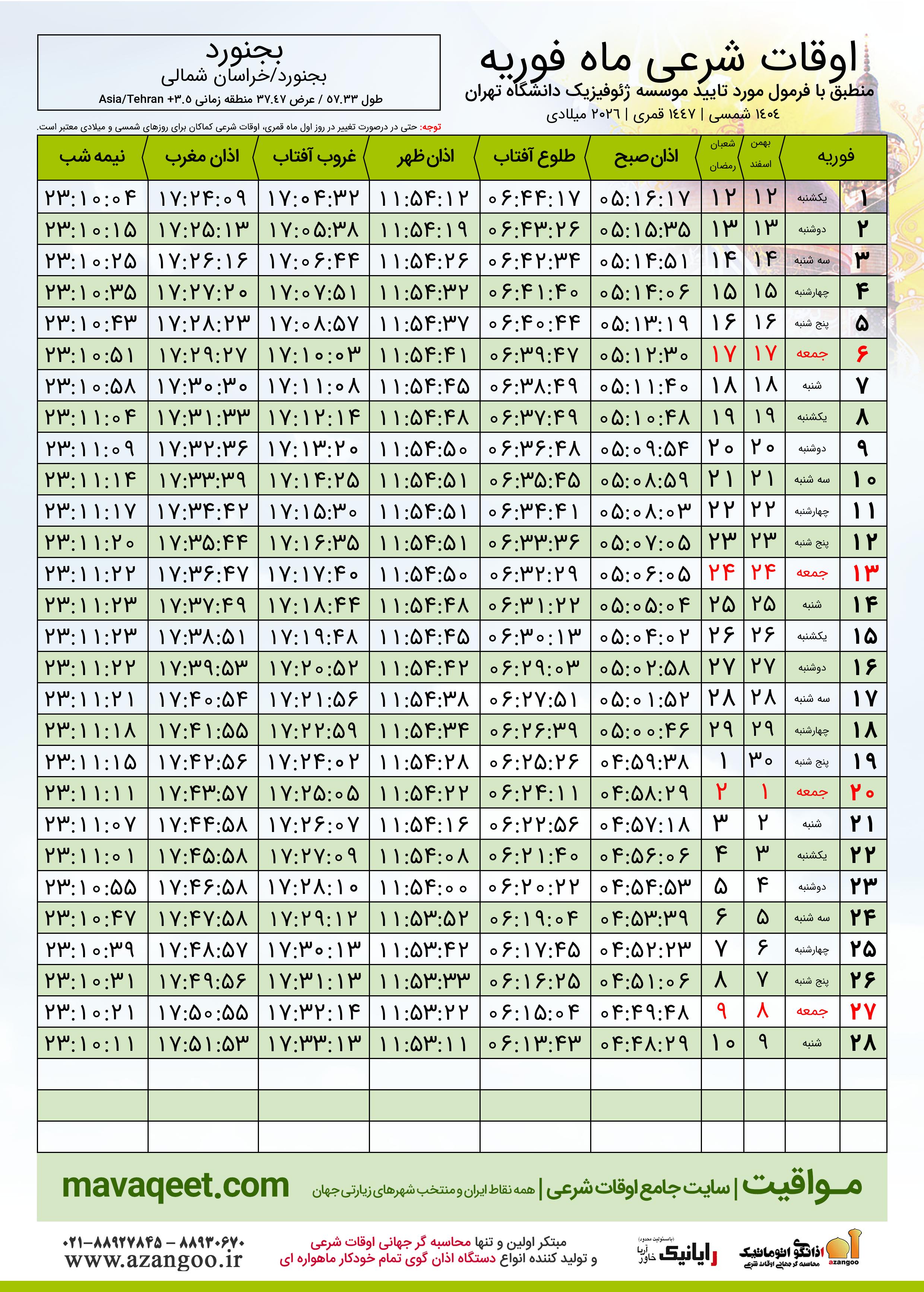دانلود اوقات شرعی ماه رمضان ٠٤ - ١٤٠٤ شمسی | ٢٠٢٦ میلادی | ١٤٤٧ قمری شهر بجنورد