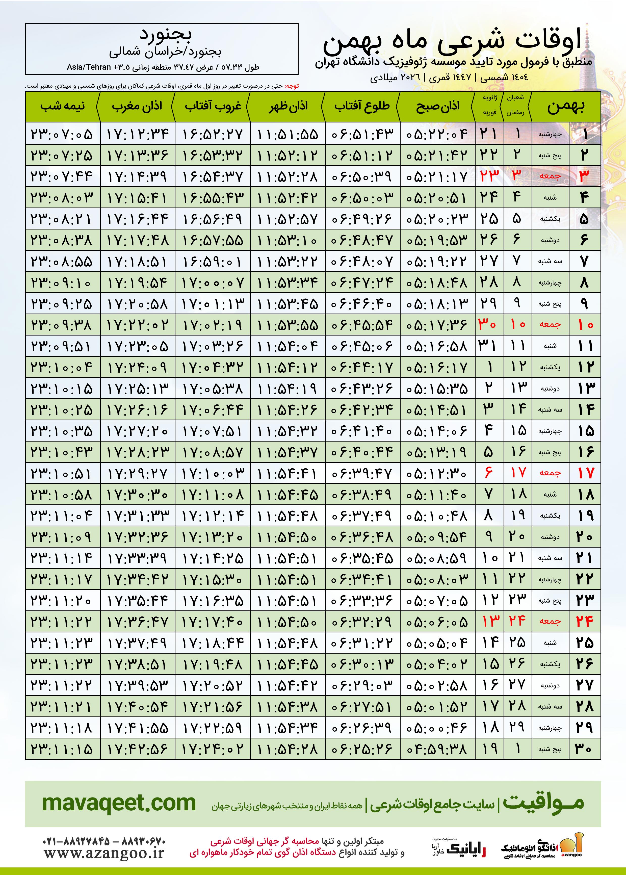 دانلود اوقات شرعی بهمن ٠٤ - ١٤٠٤ شهر بجنورد