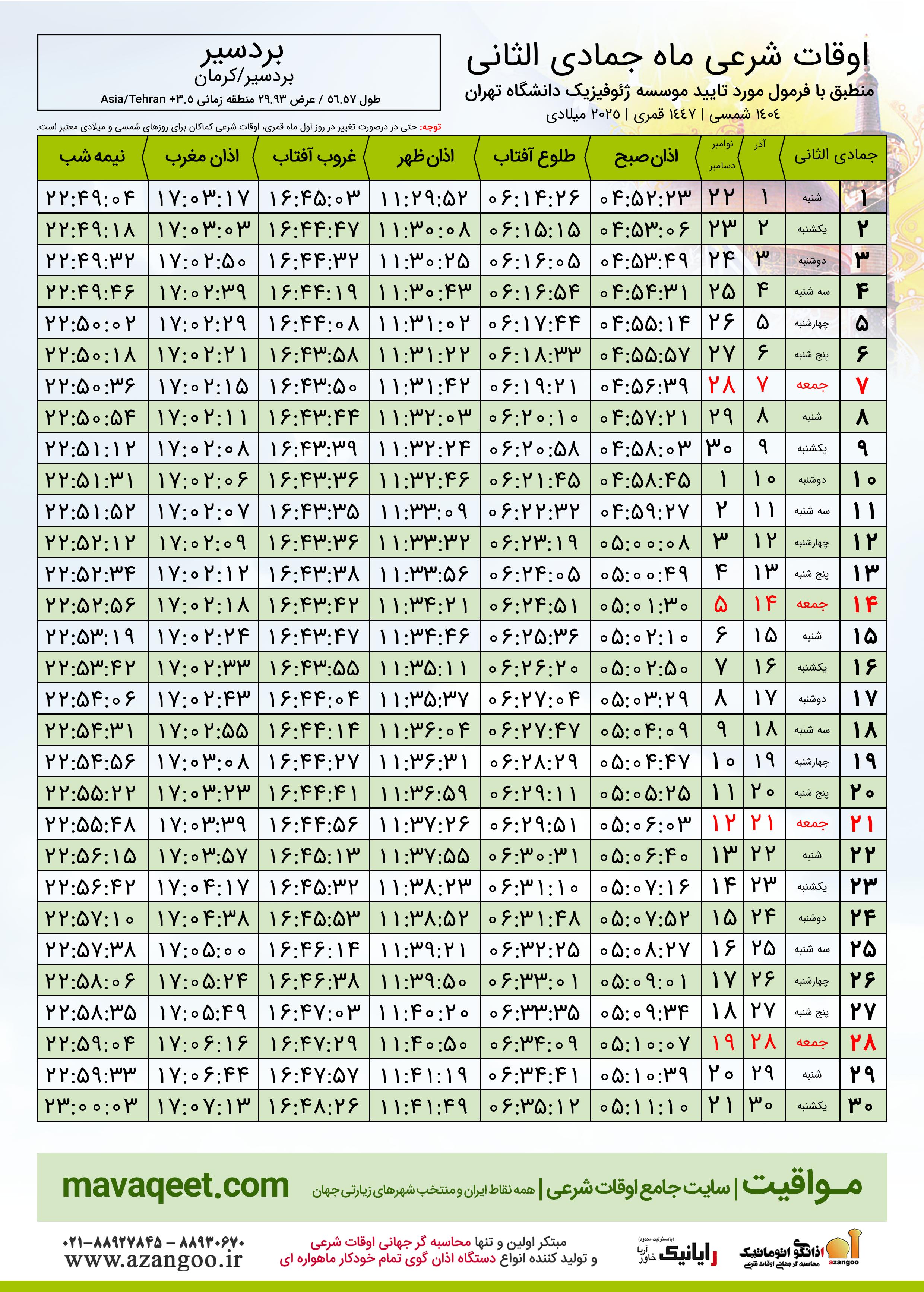 اوقات شرعی ماه جمادی الثانی ١٤٤٧ هـ.ق شهر بردسیر بر