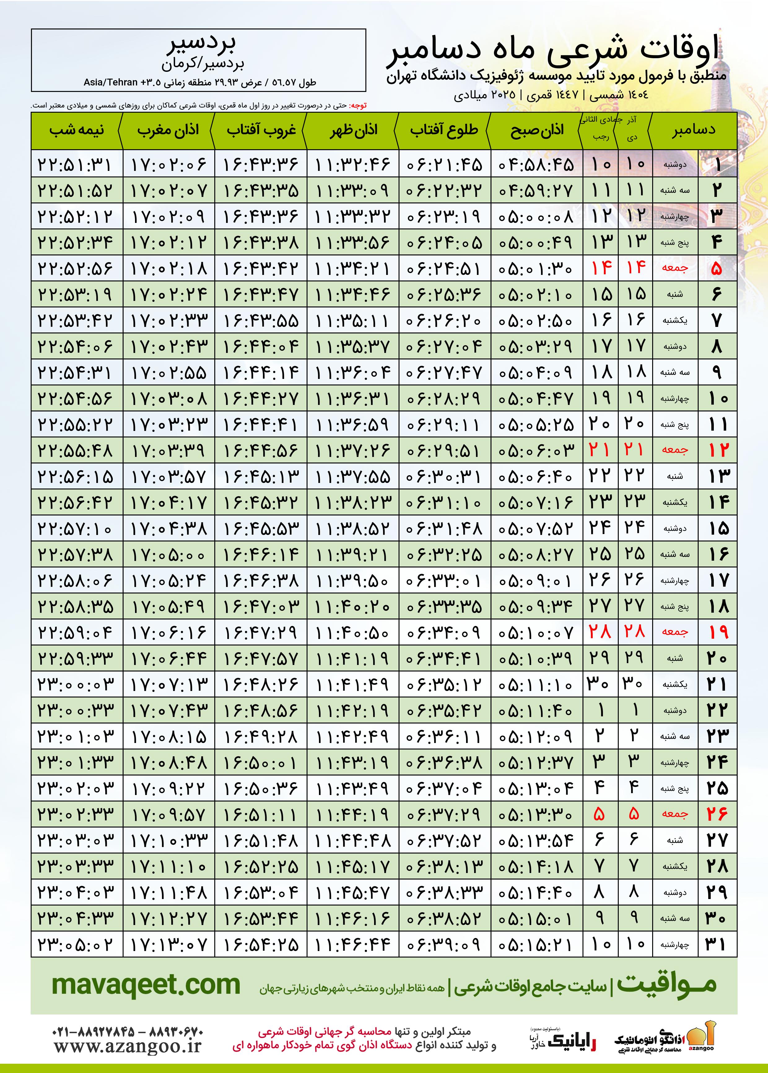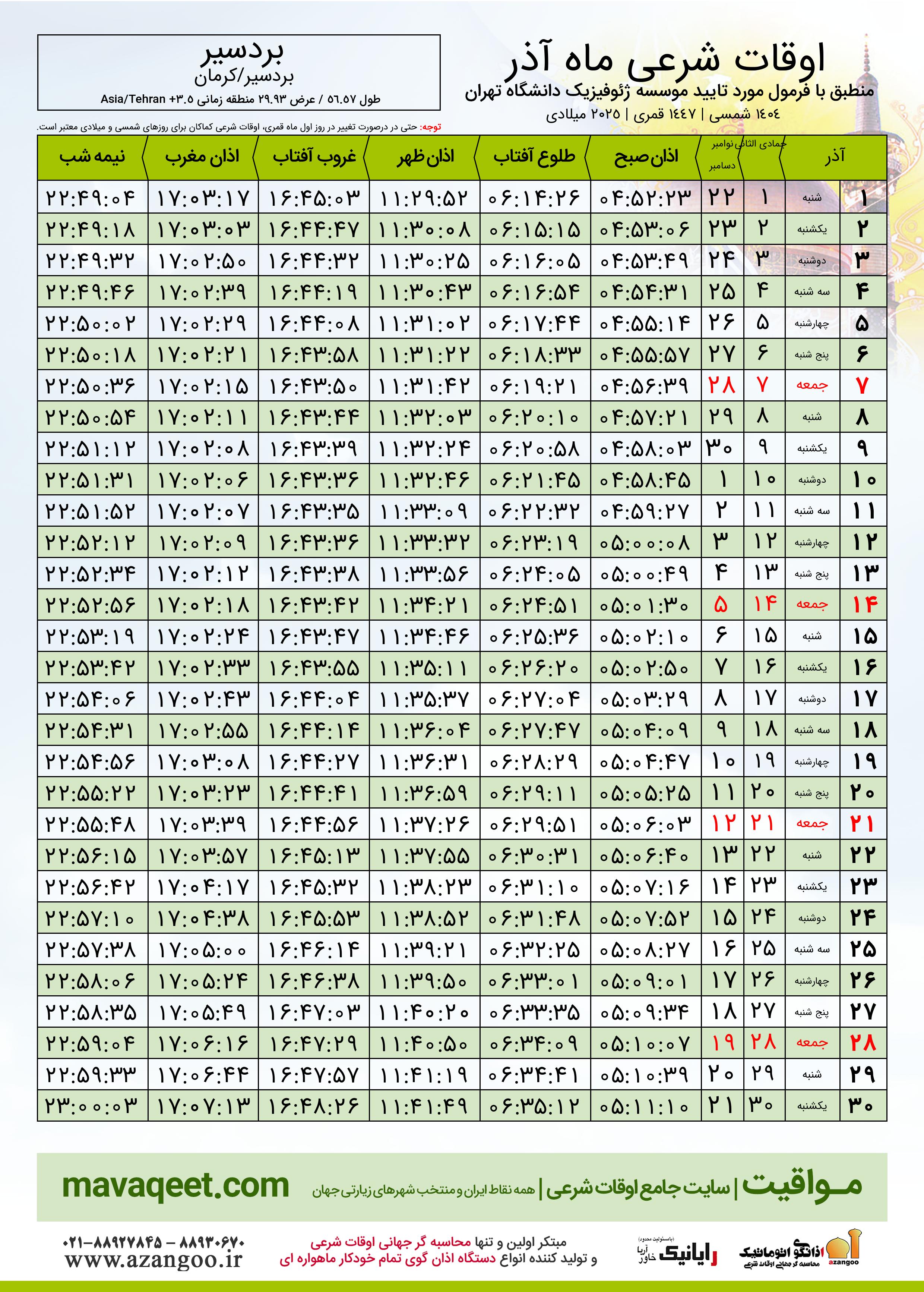 جدول اوقات شرعی آذر ١٤٠٤ شمسی شهر بردسیر