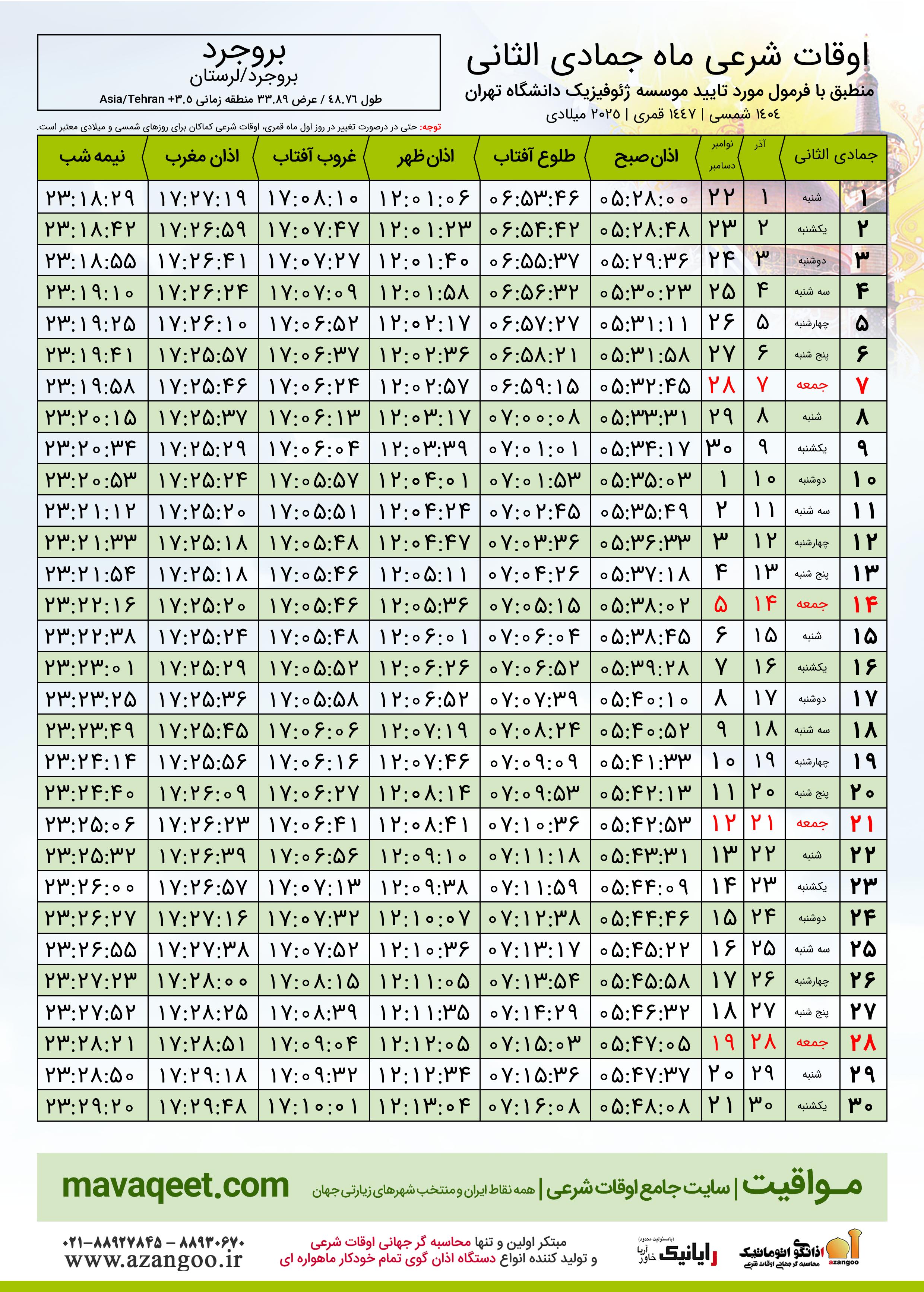 جدول اوقات شرعی جمادی الثانی ١٤٤٧ قمری شهر بروجرد