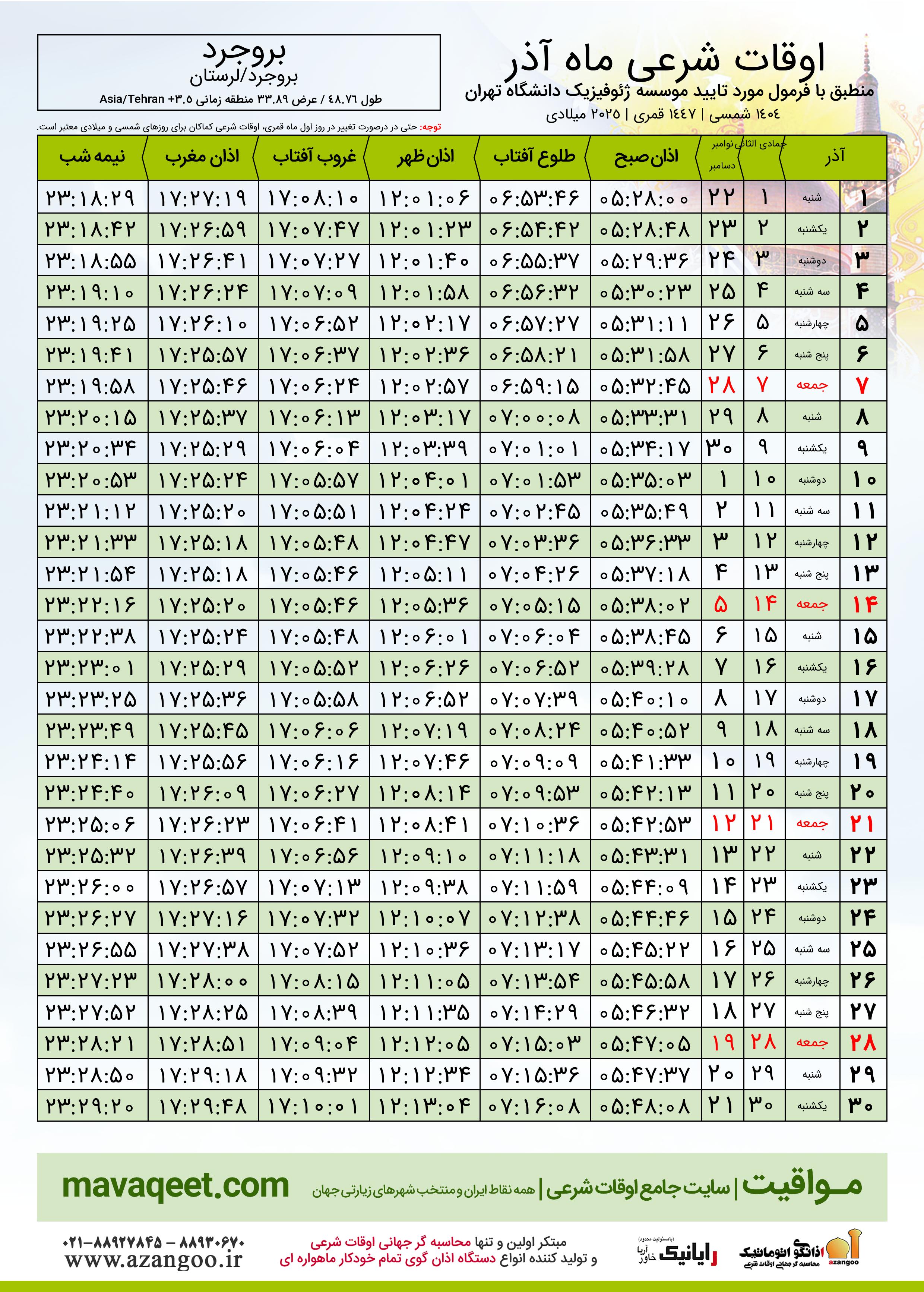 جدول اوقات شرعی آذر ١٤٠٤ شمسی شهر بروجرد