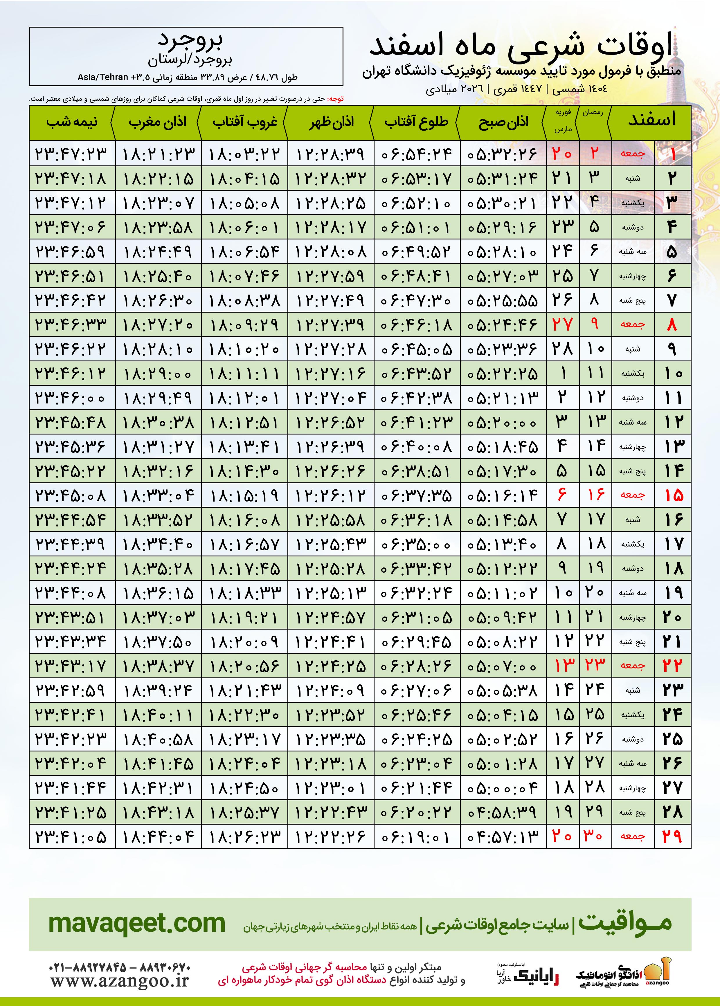 اوقات شرعی ماه رمضان شهر بروجرد ١٤٠٤ - ٠٤ شمسی | ٢٠٢٦ میلادی