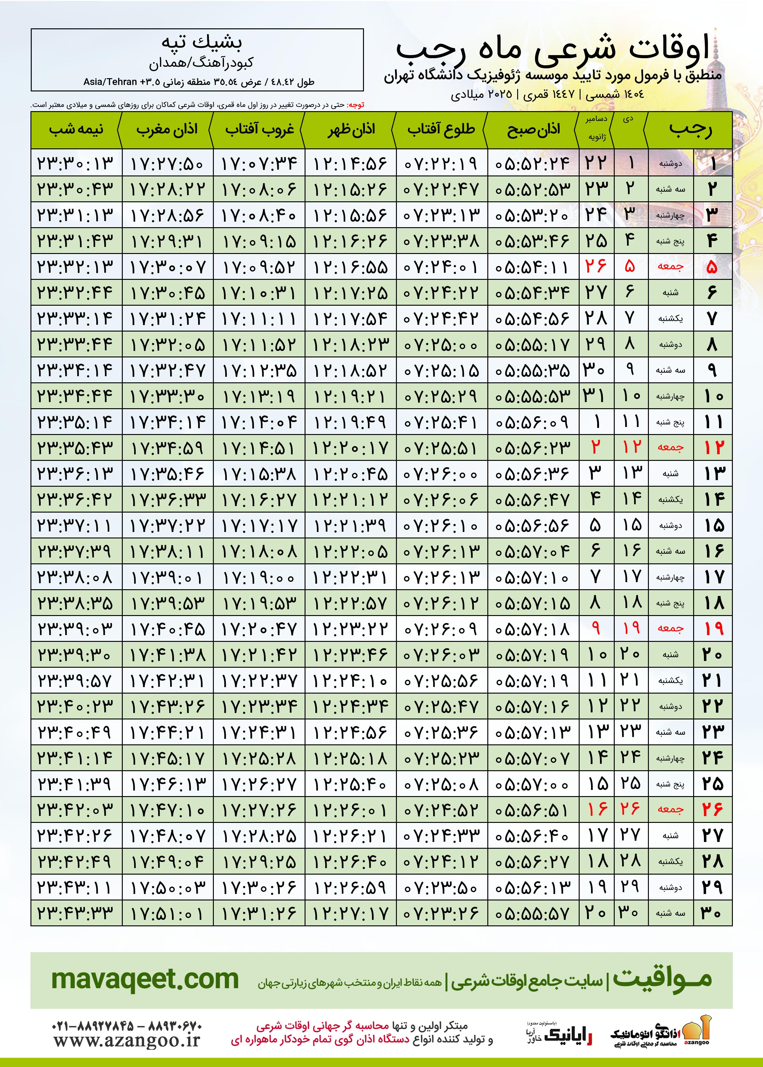 اوقات شرعی رجب ١٤٤٧ قمری شهر بشیک تپه