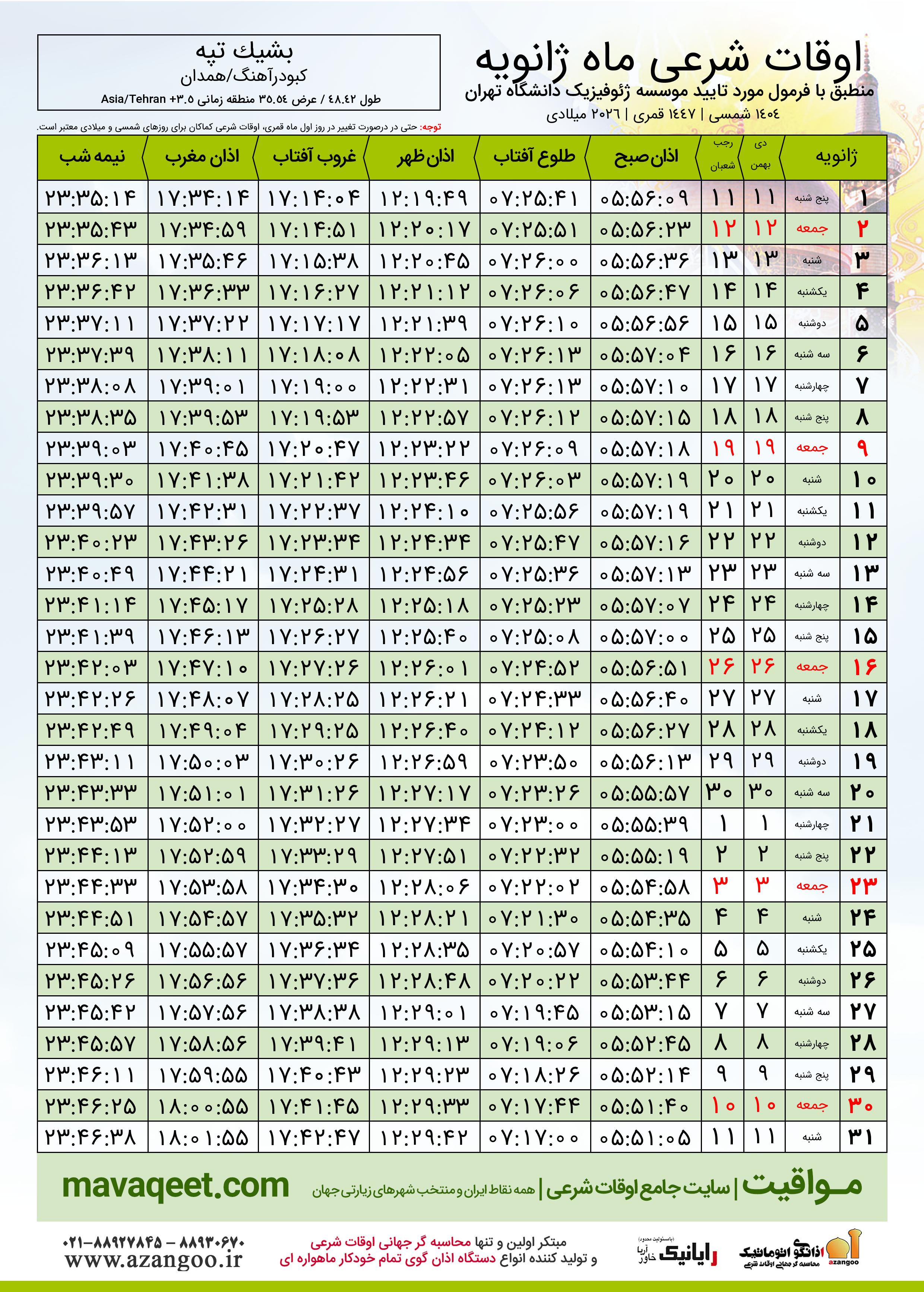 دانلود اوقات شرعی ژانویه ٢٠٢٦ شهر بشیک تپه
