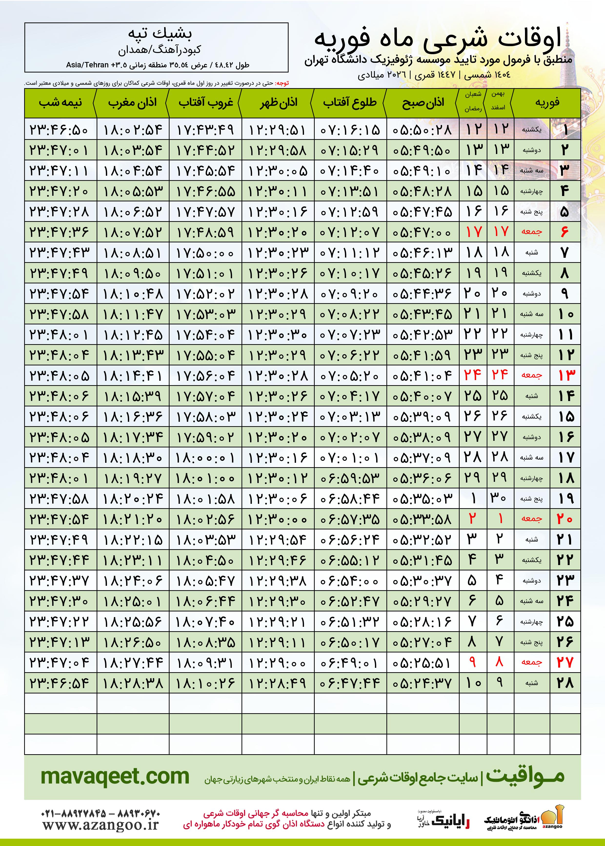 اوقات شرعی فوریه ٢٠٢٦ شهر بشیک تپه + دانلود