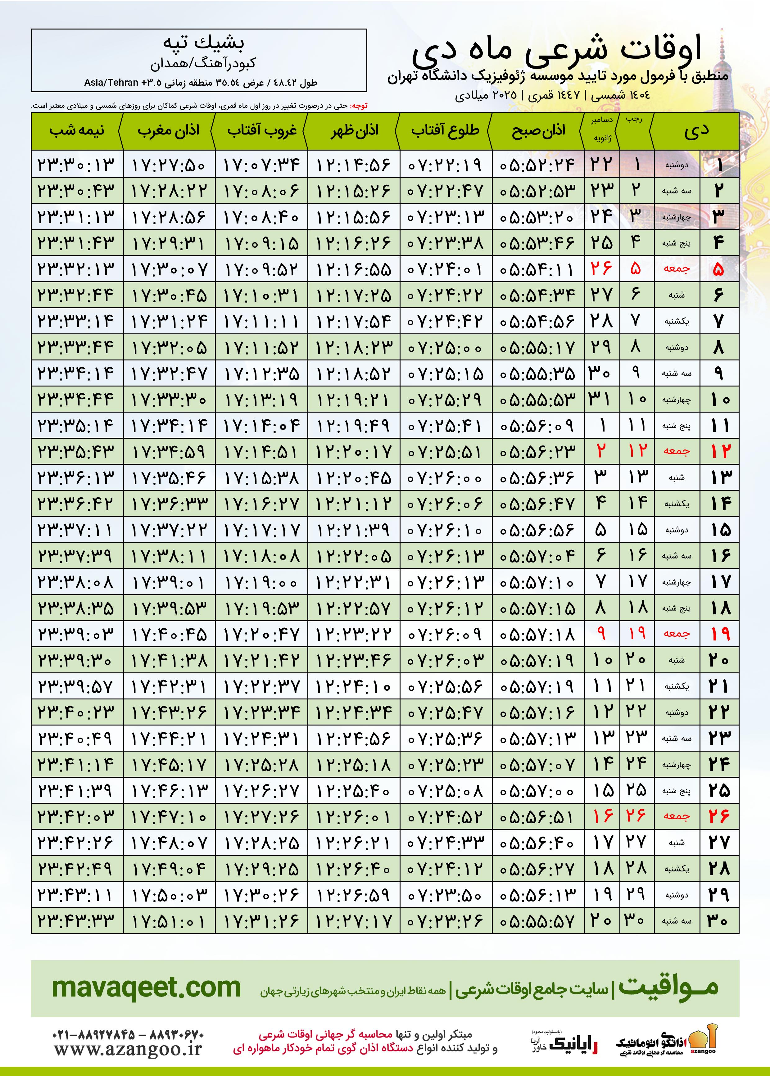 اوقات شرعی دی ١٤٠٤ شمسی شهر بشیک تپه
