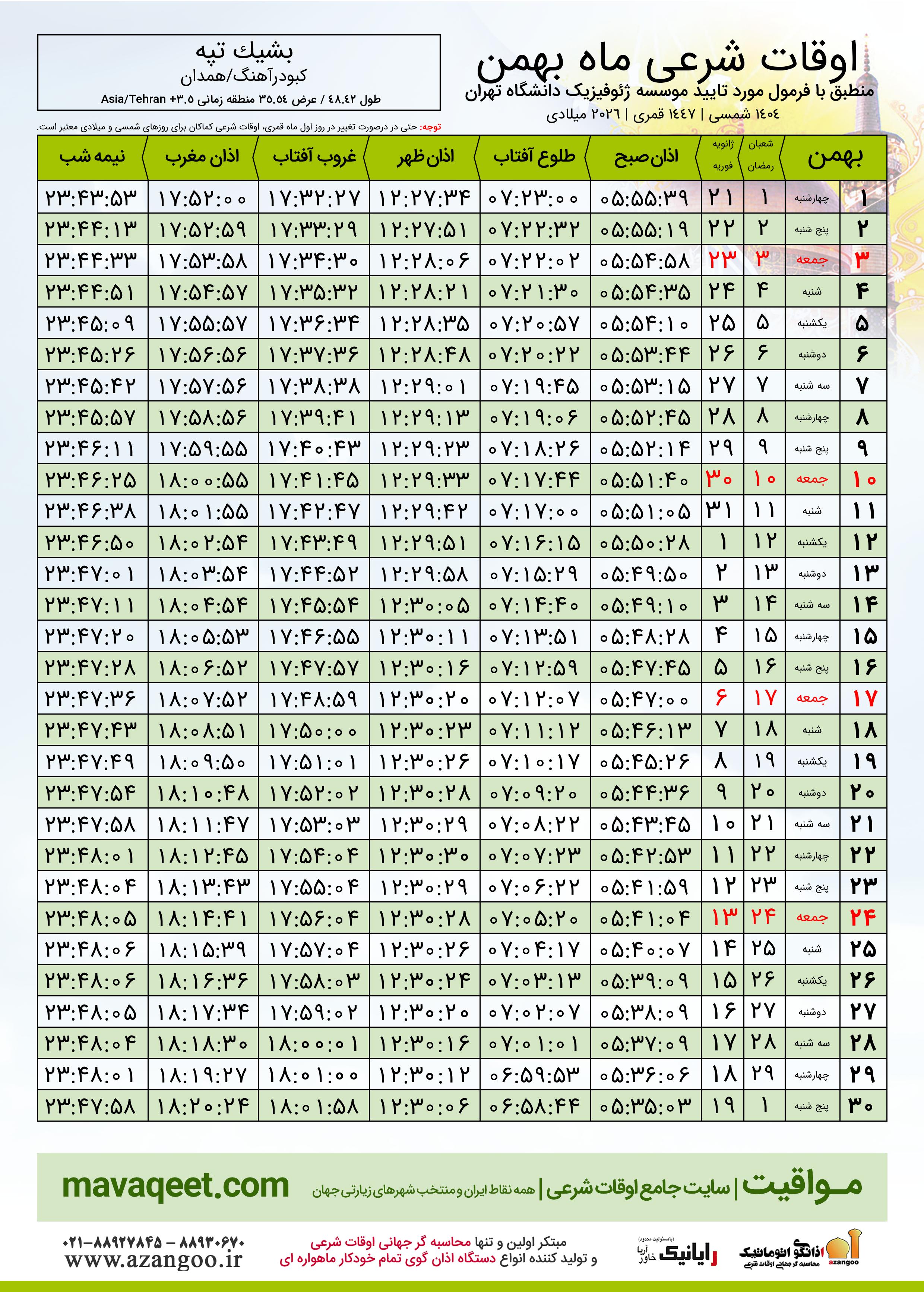 دانلود اوقات شرعی بهمن ٠٤ - ١٤٠٤ شهر بشیک تپه