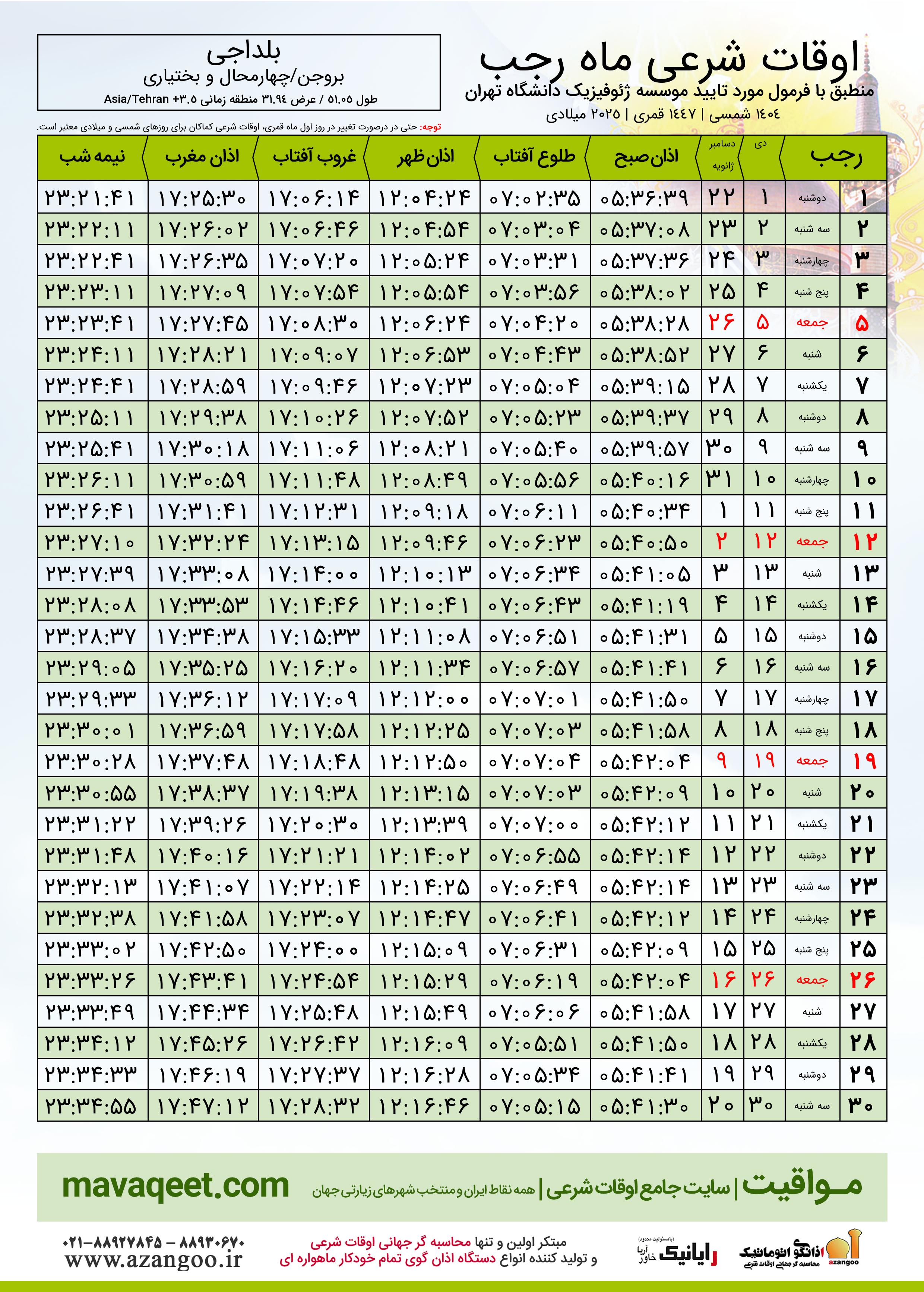 جدول اوقات شرعی رجب ١٤٤٧ قمری شهر بلداجی