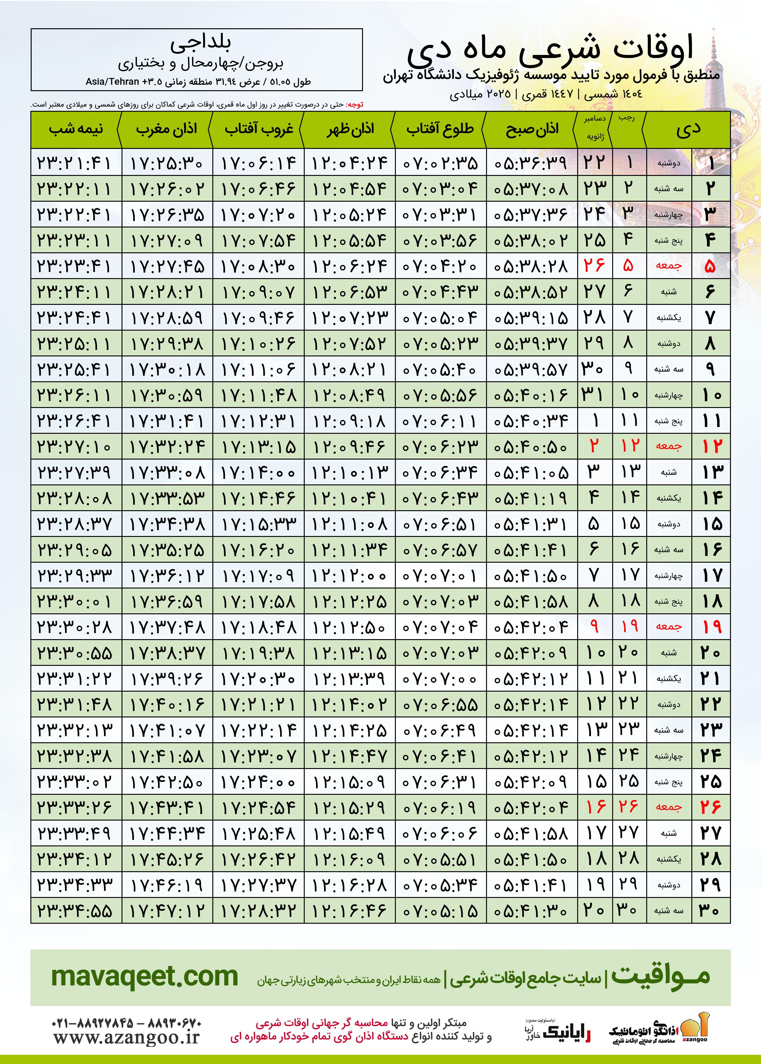 دانلود اوقات شرعی دی ٠٤ - ١٤٠٤ شهر بلداجی