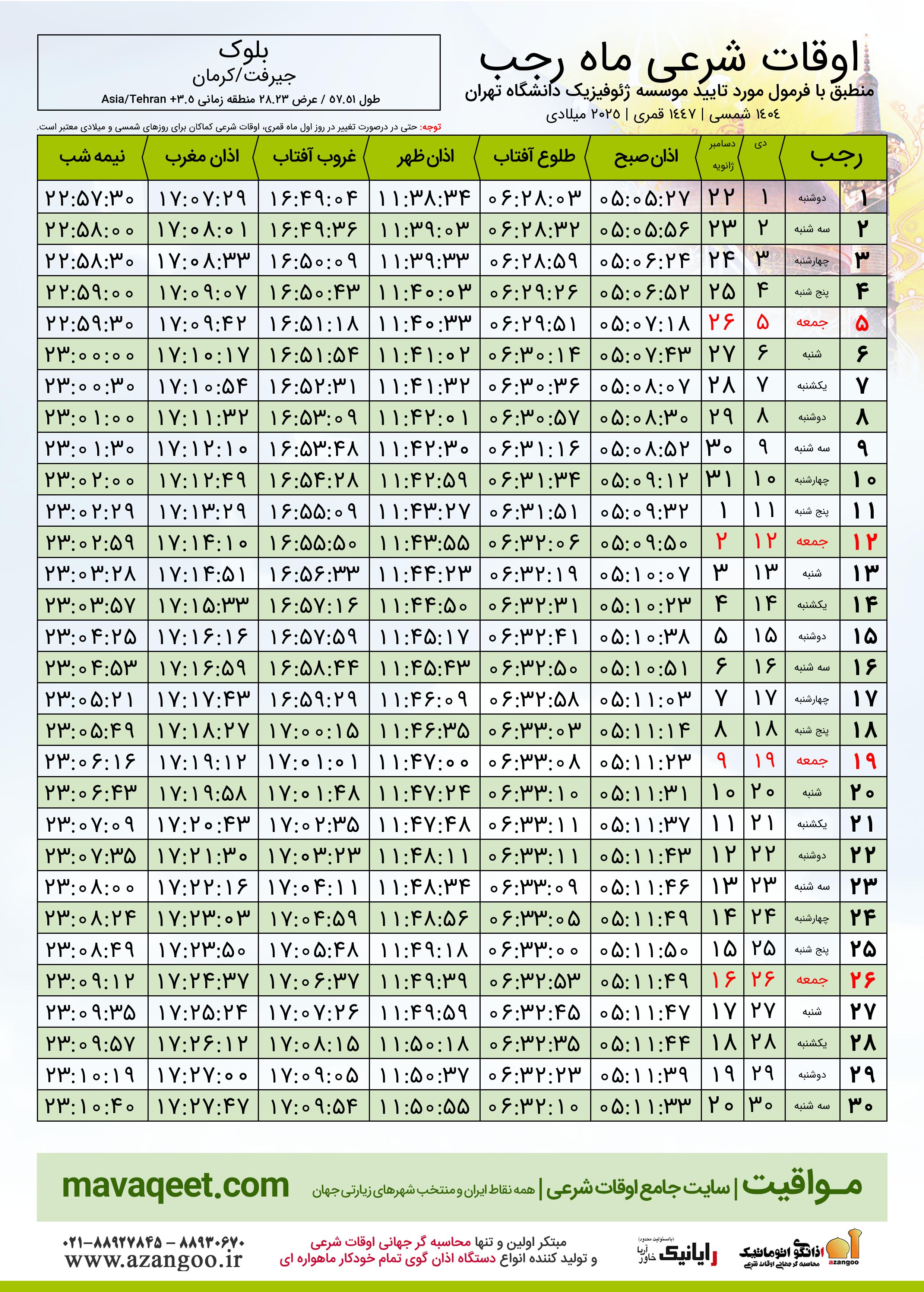 اوقات شرعی ماه رجب ١٤٤٧ هـ.ق شهر بلوک بر