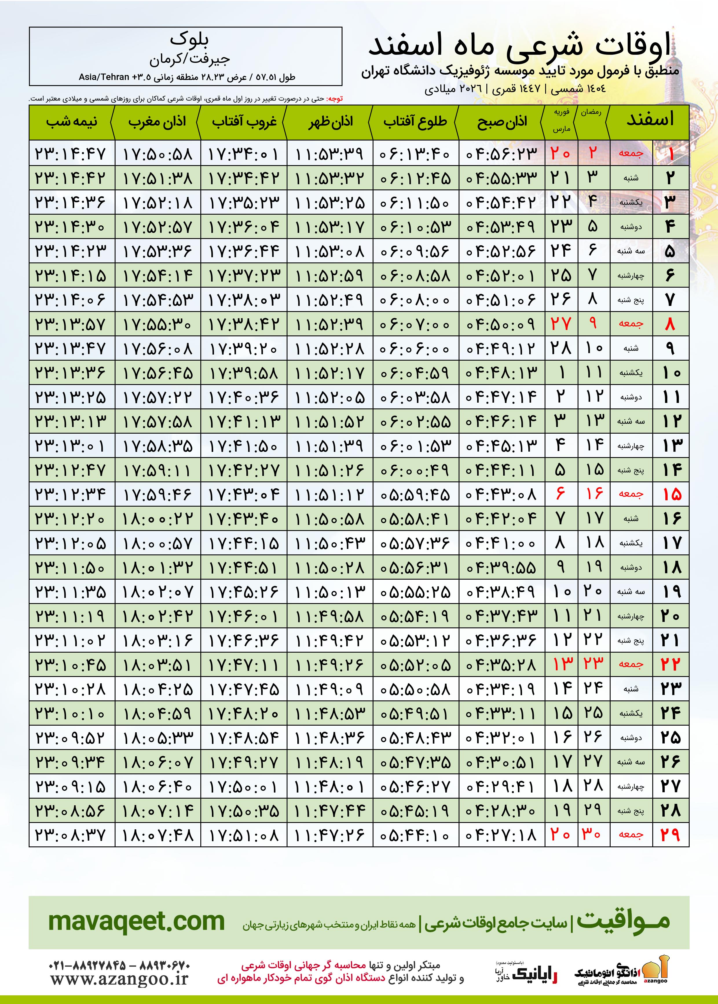 جدول اوقات شرعی رمضان ١٤٤٧ قمری شهر بلوک