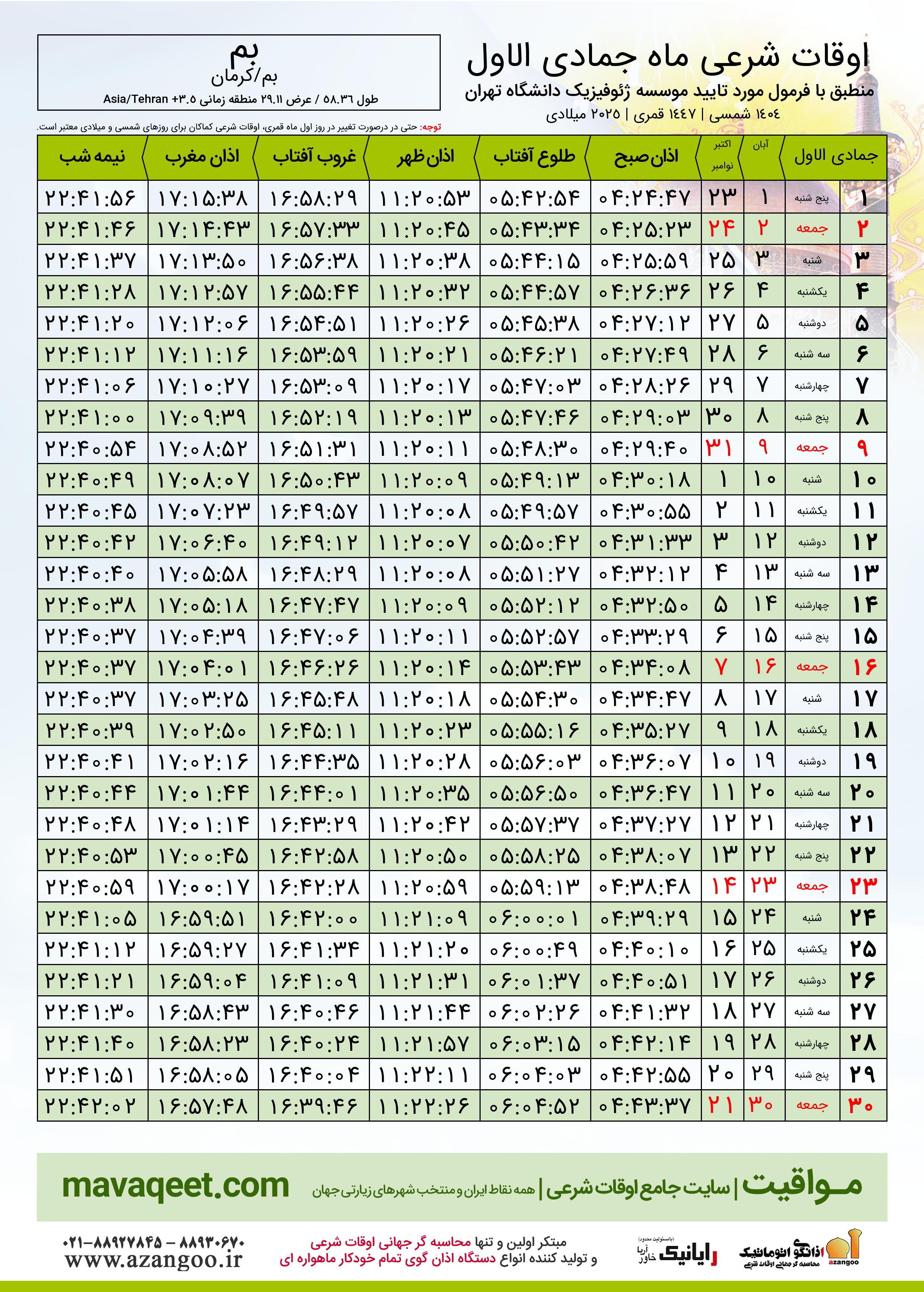 جدول اوقات شرعی جمادی الاول ١٤٤٧ قمری شهر بم