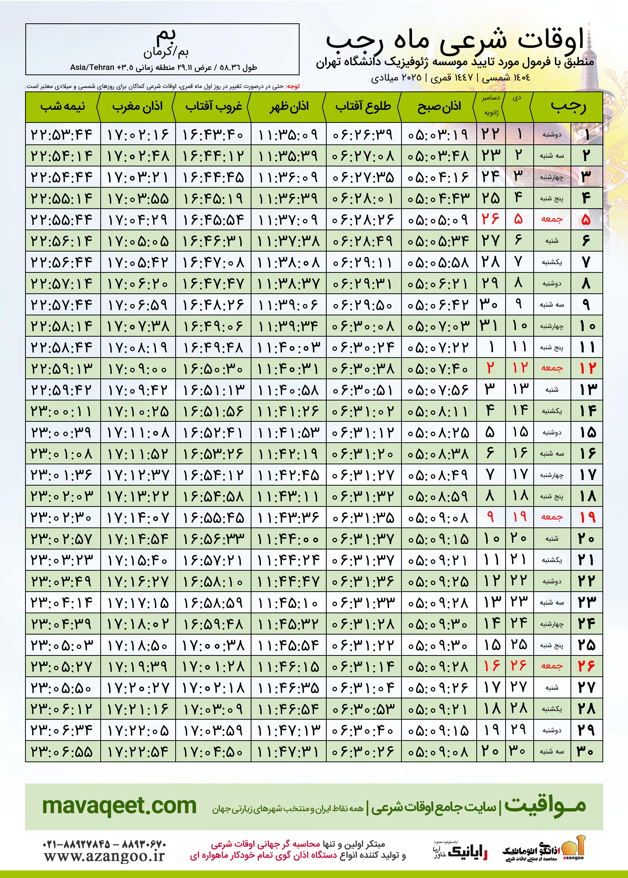 جدول اوقات شرعی رجب ١٤٤٧ قمری شهر بم