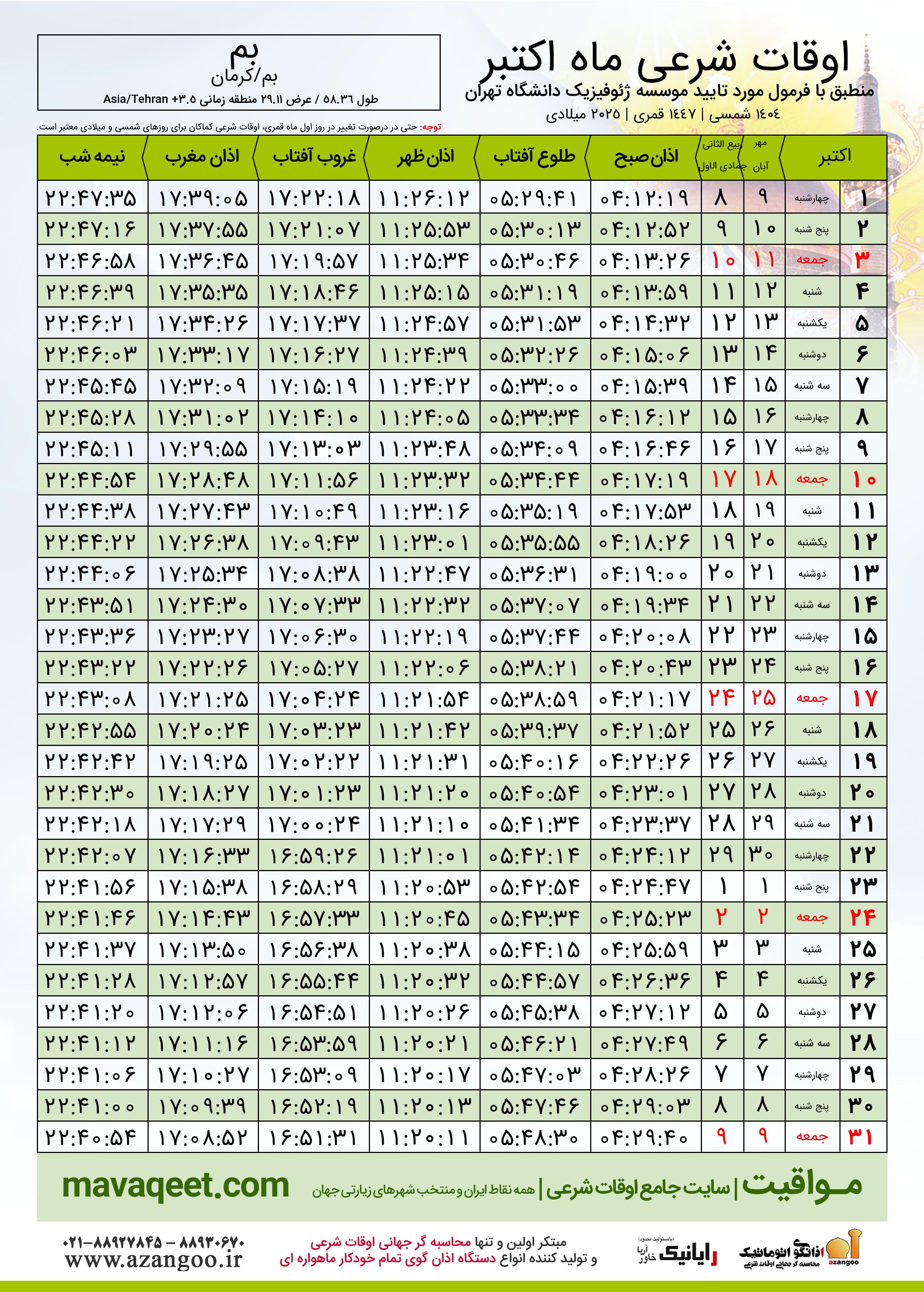 جدول اوقات شرعی اکتبر ٢٠٢٥ میلادی شهر بم