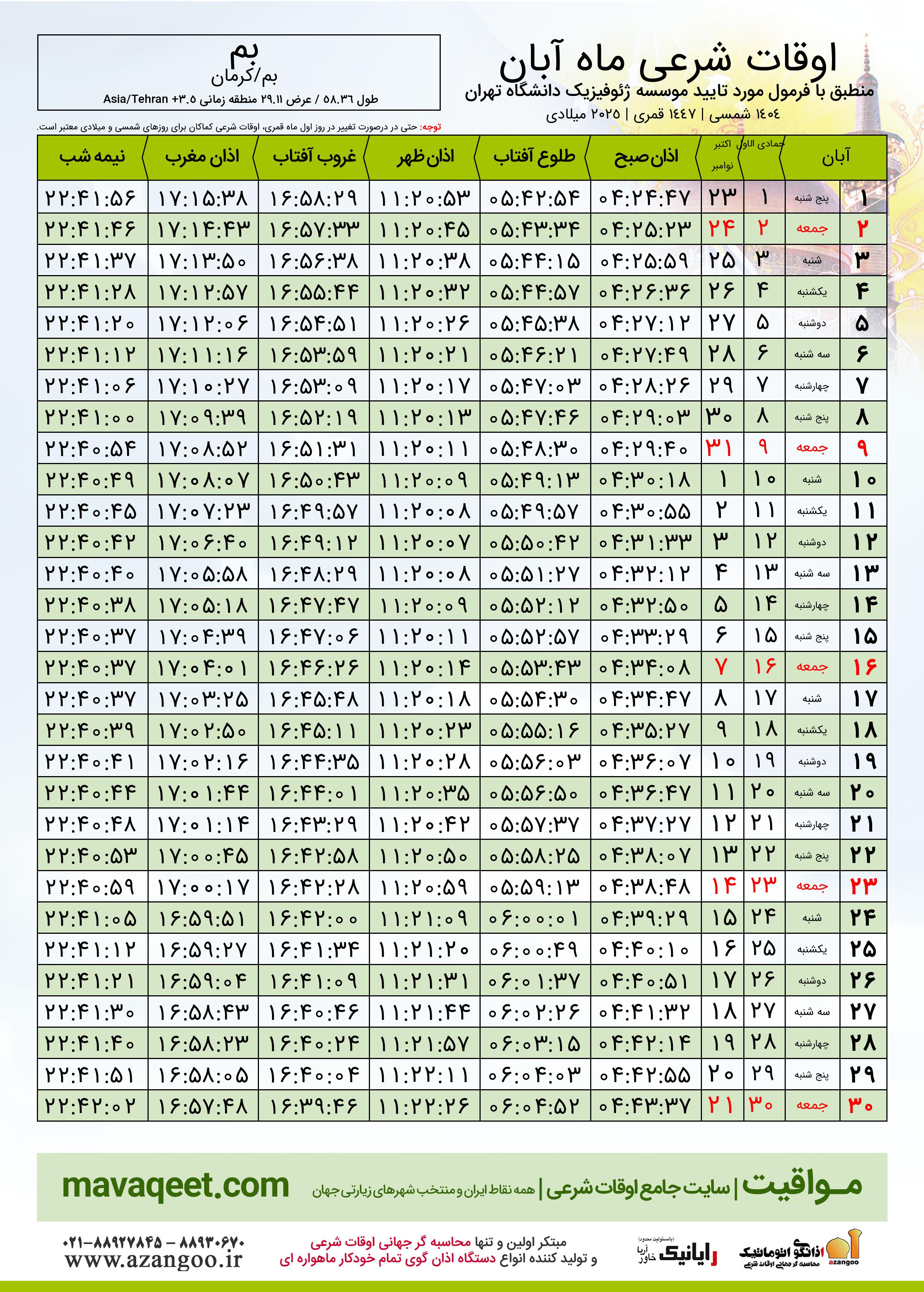 جدول اوقات شرعی آبان ١٤٠٤ شمسی شهر بم
