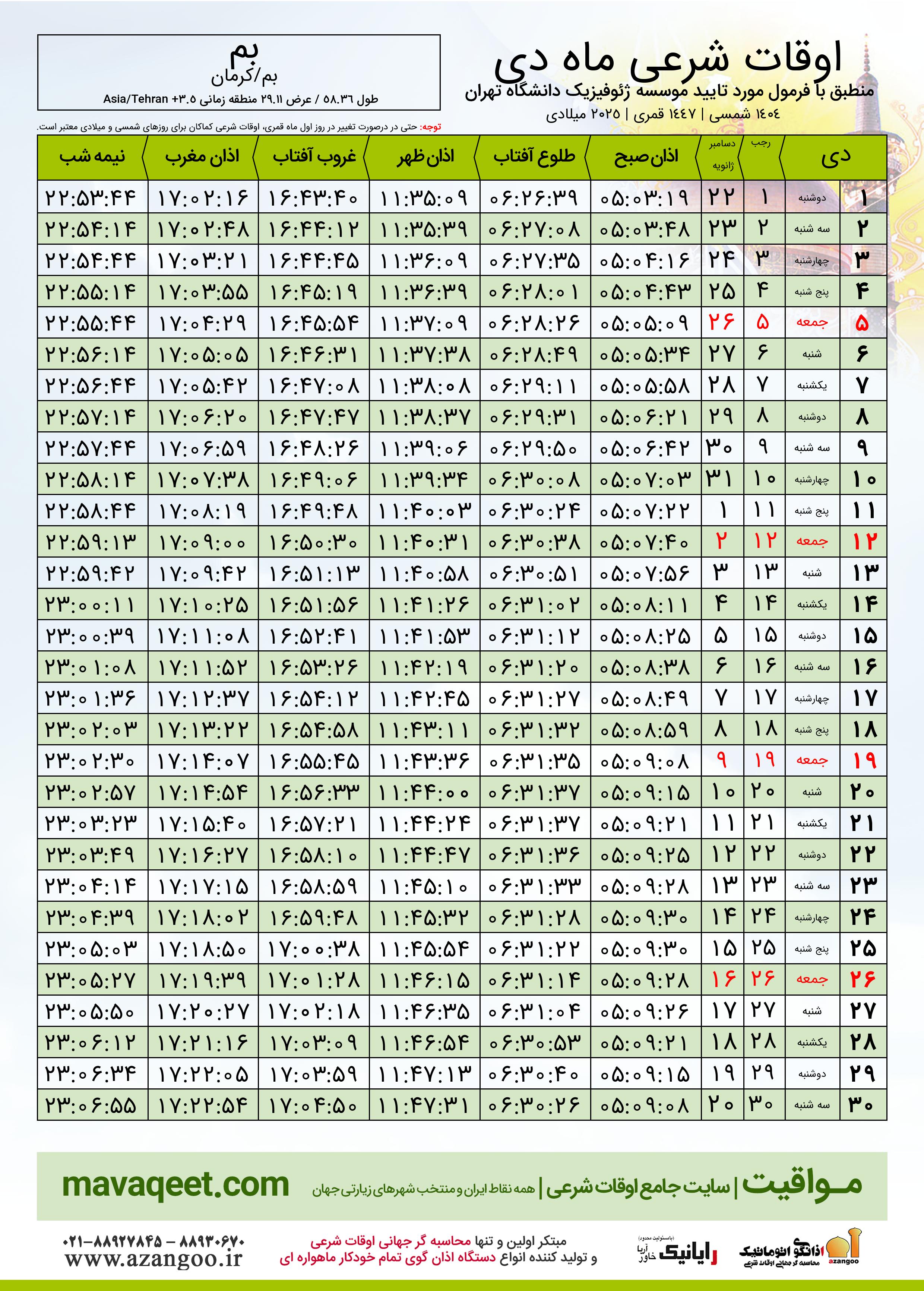 اوقات شرعی دی ١٤٠٤ شمسی شهر بم