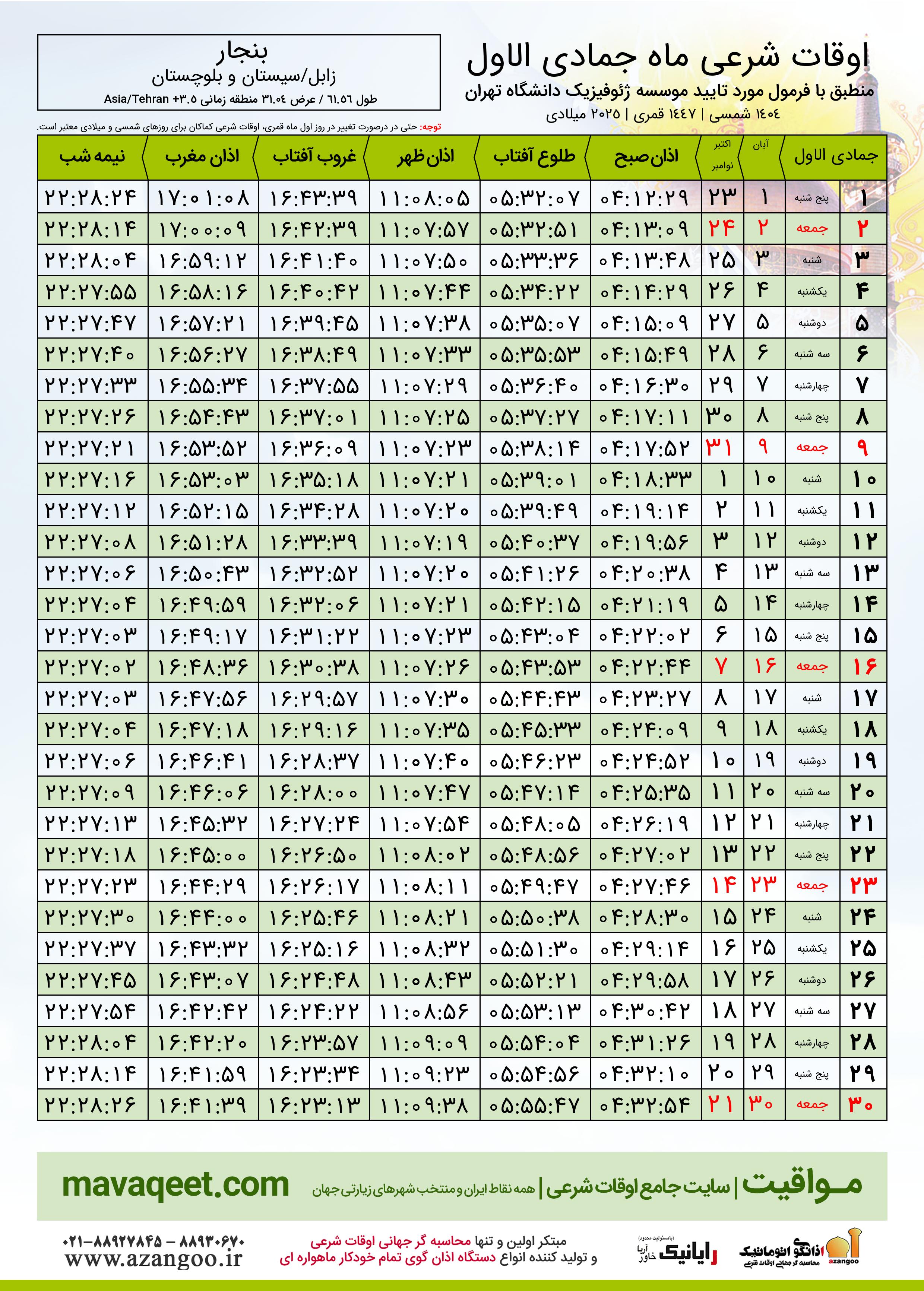 جدول اوقات شرعی جمادی الاول ١٤٤٧ قمری شهر بنجار
