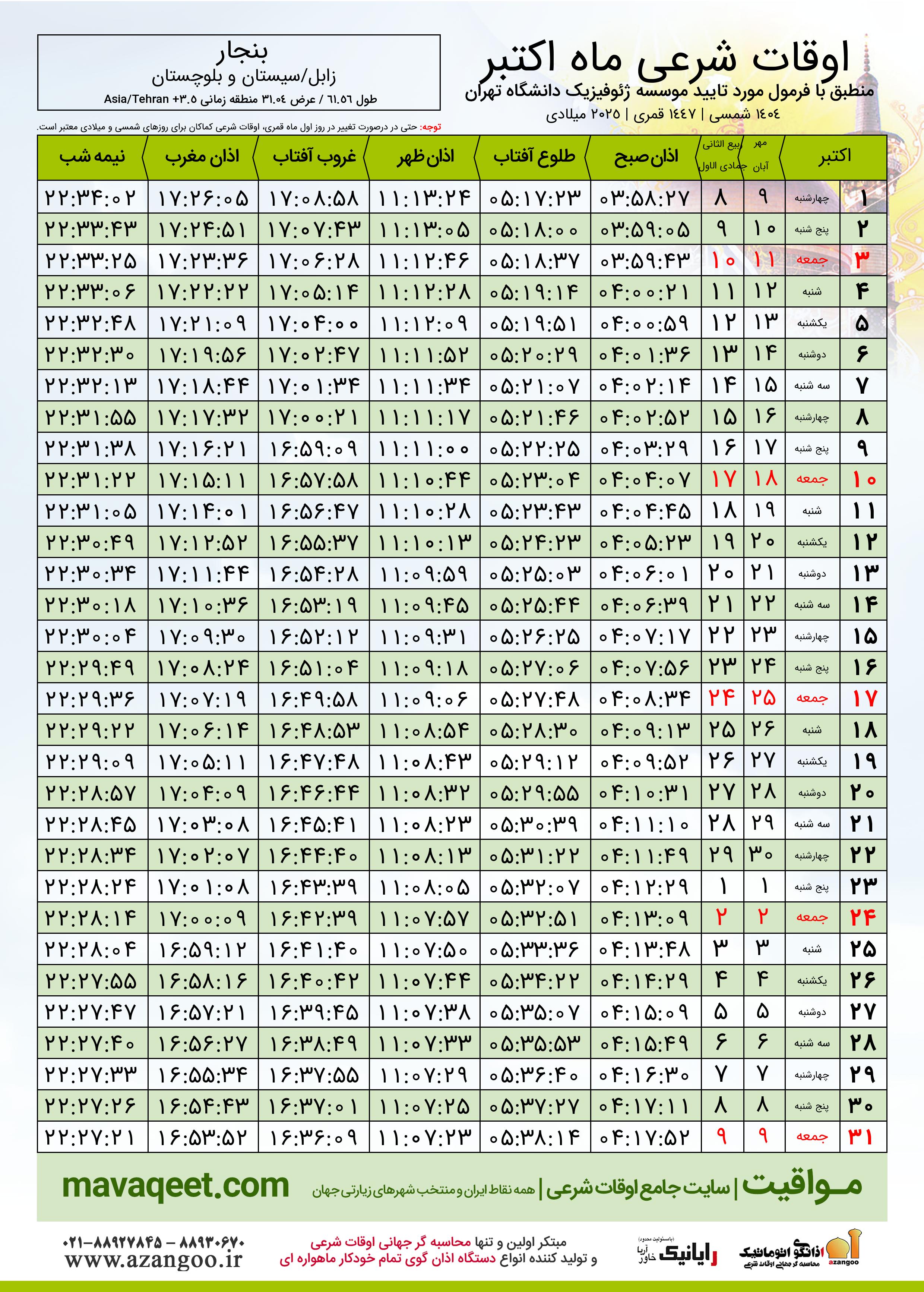 جدول اوقات شرعی اکتبر ٢٠٢٥ میلادی شهر بنجار