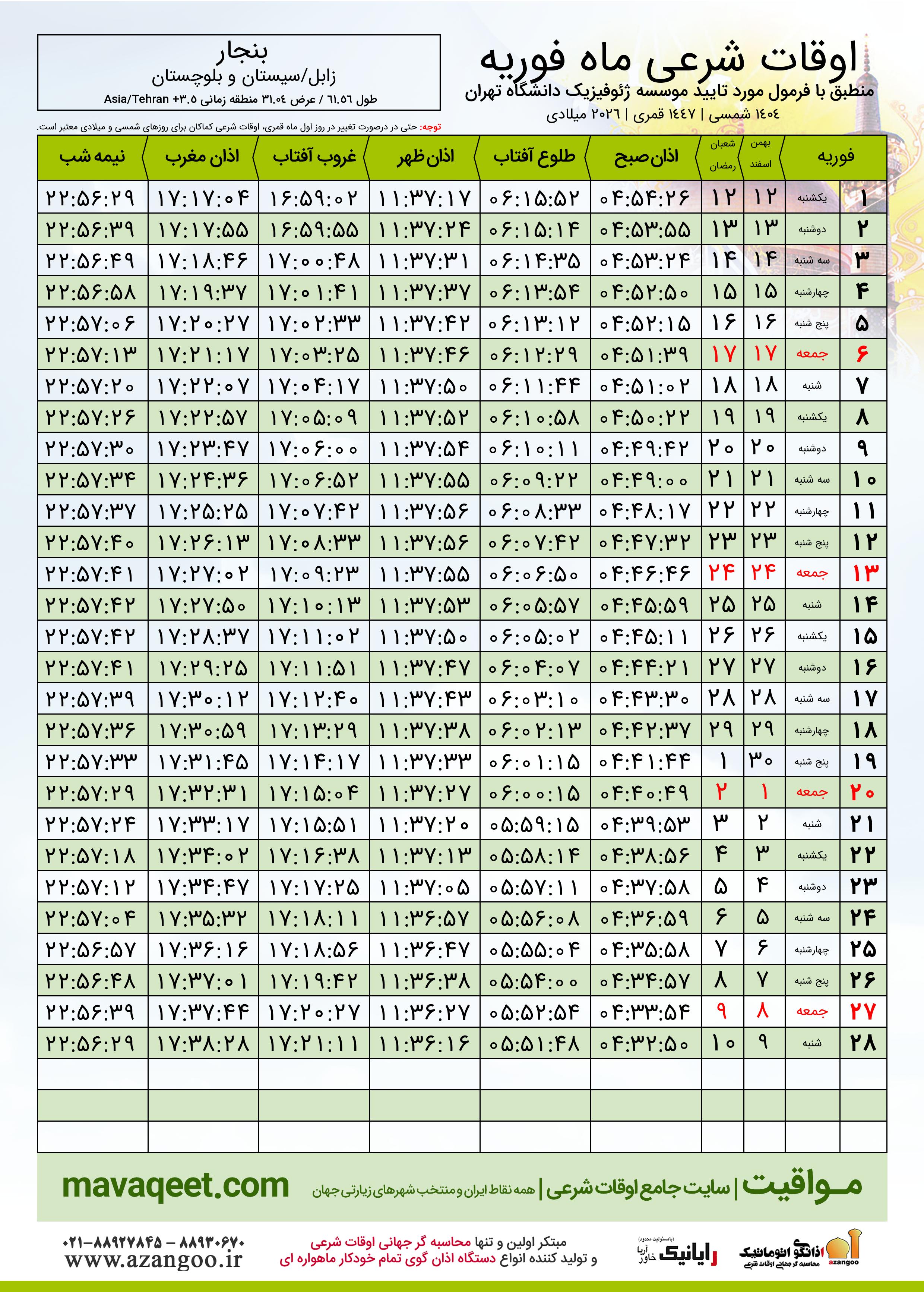 اوقات شرعی ماه رمضان شهر بنجار ١٤٠٤ - ٠٤ شمسی | ٢٠٢٦ میلادی