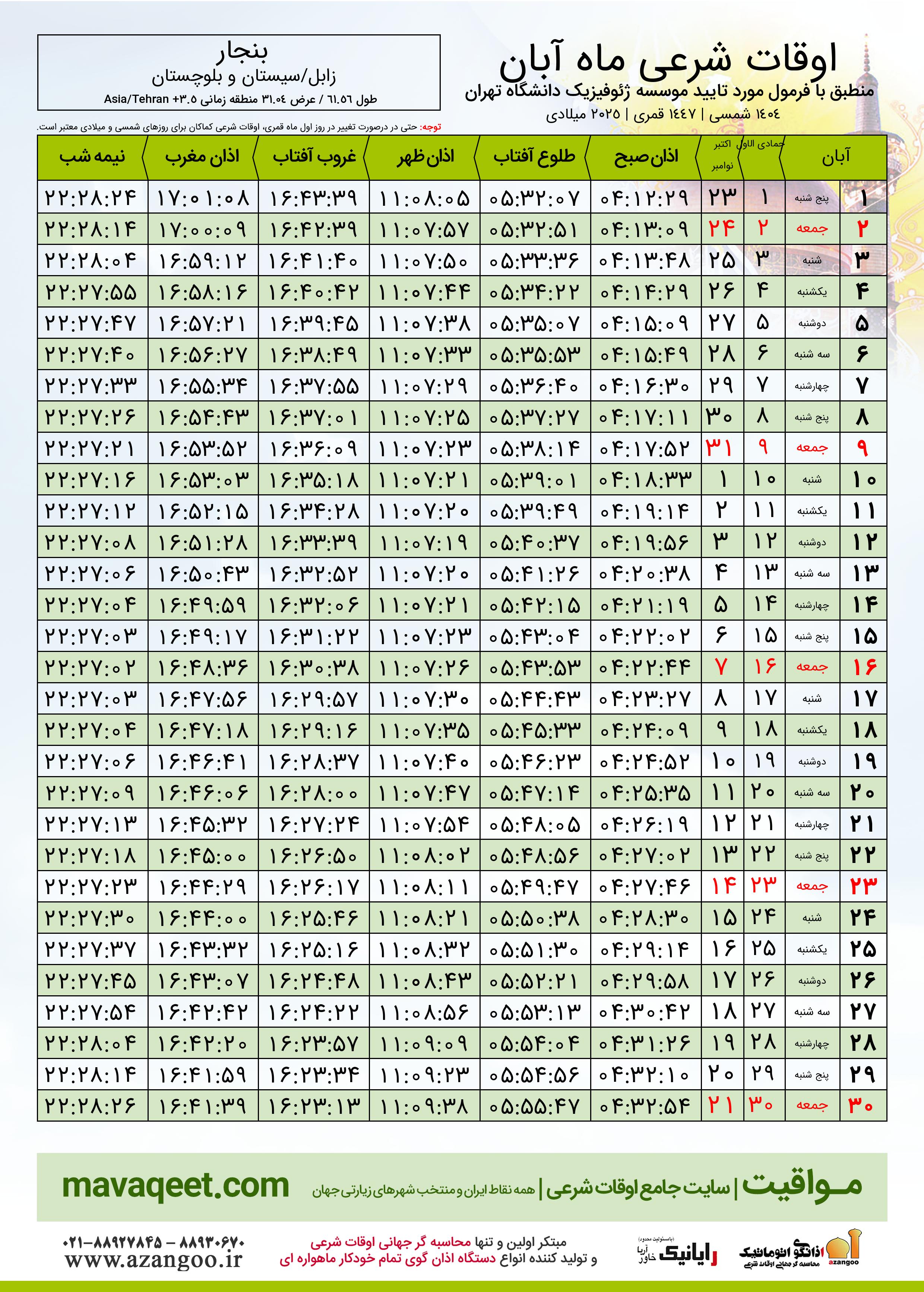 جدول اوقات شرعی آبان ١٤٠٤ شمسی شهر بنجار