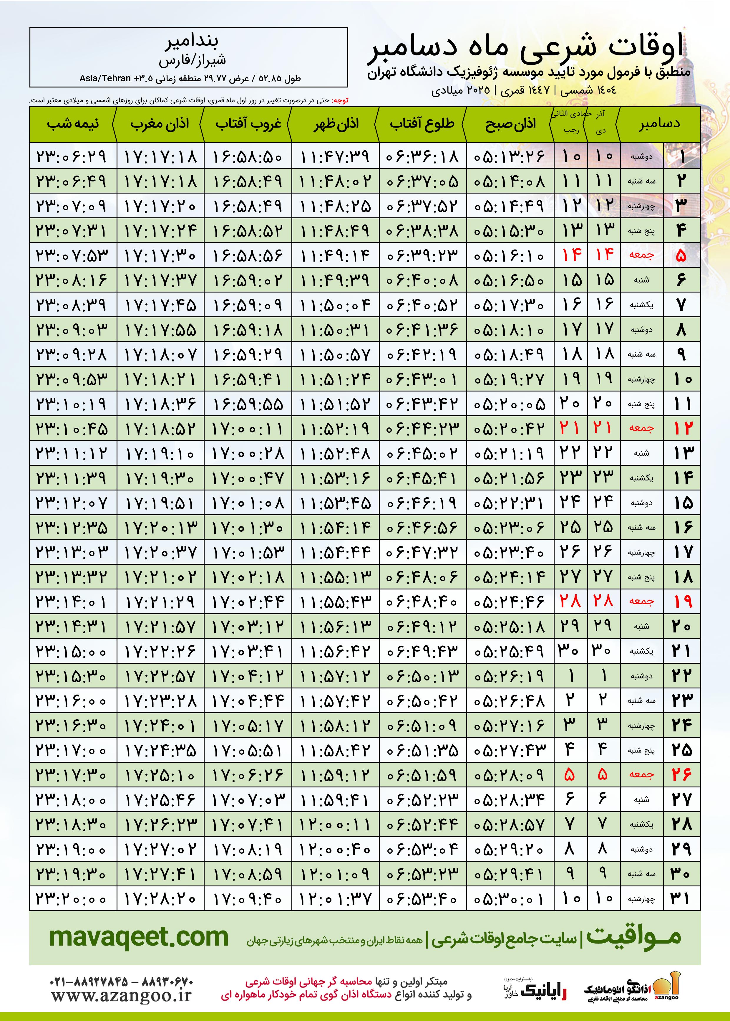 جدول اوقات شرعی دسامبر ٢٠٢٥ میلادی شهر بندامیر