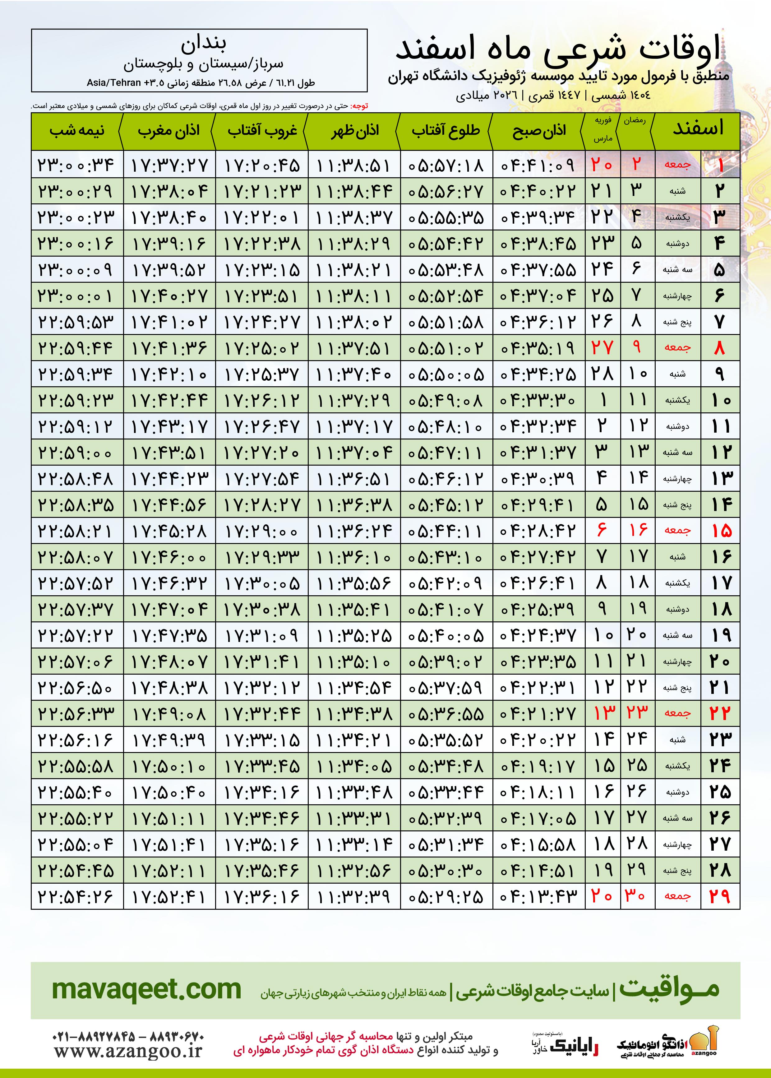 جدول اوقات شرعی رمضان ١٤٤٧ قمری شهر بندان