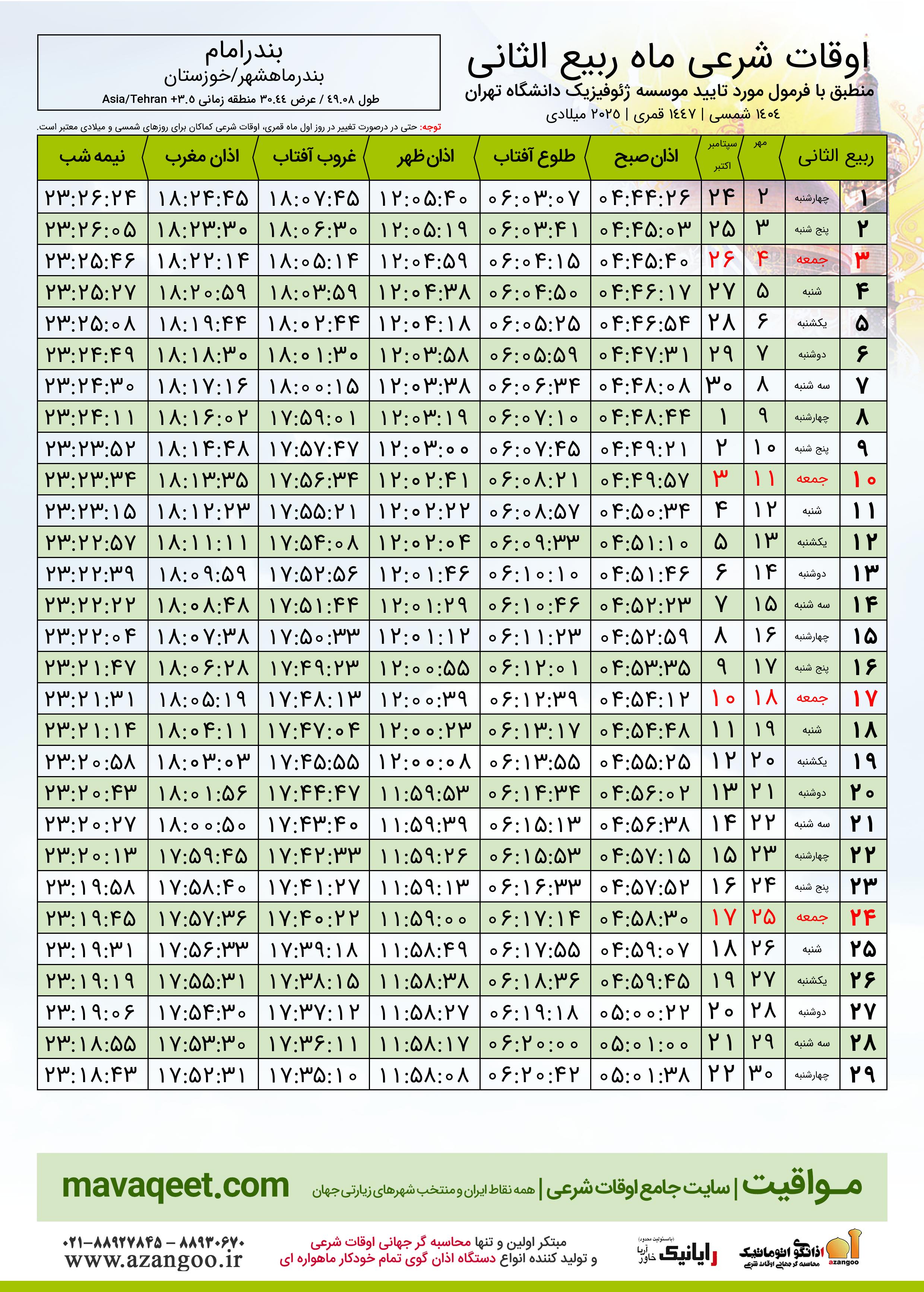جدول اوقات شرعی ربیع الثانی ١٤٤٧ قمری شهر بندرامام