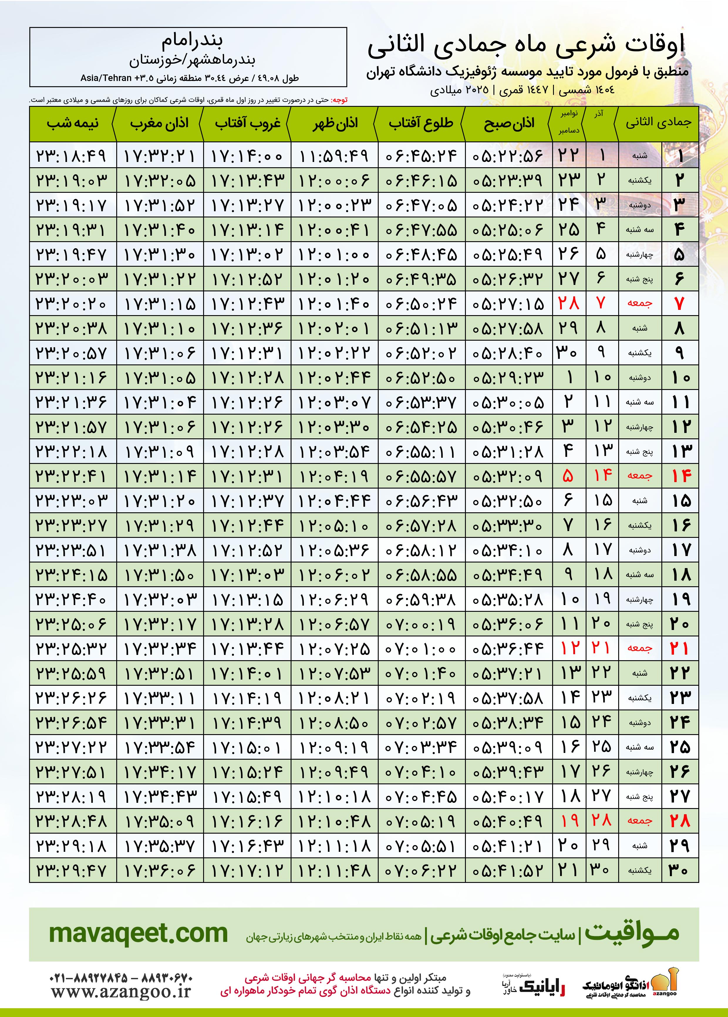 اوقات شرعی ماه جمادی الثانی ١٤٤٧ هـ.ق شهر بندرامام بر