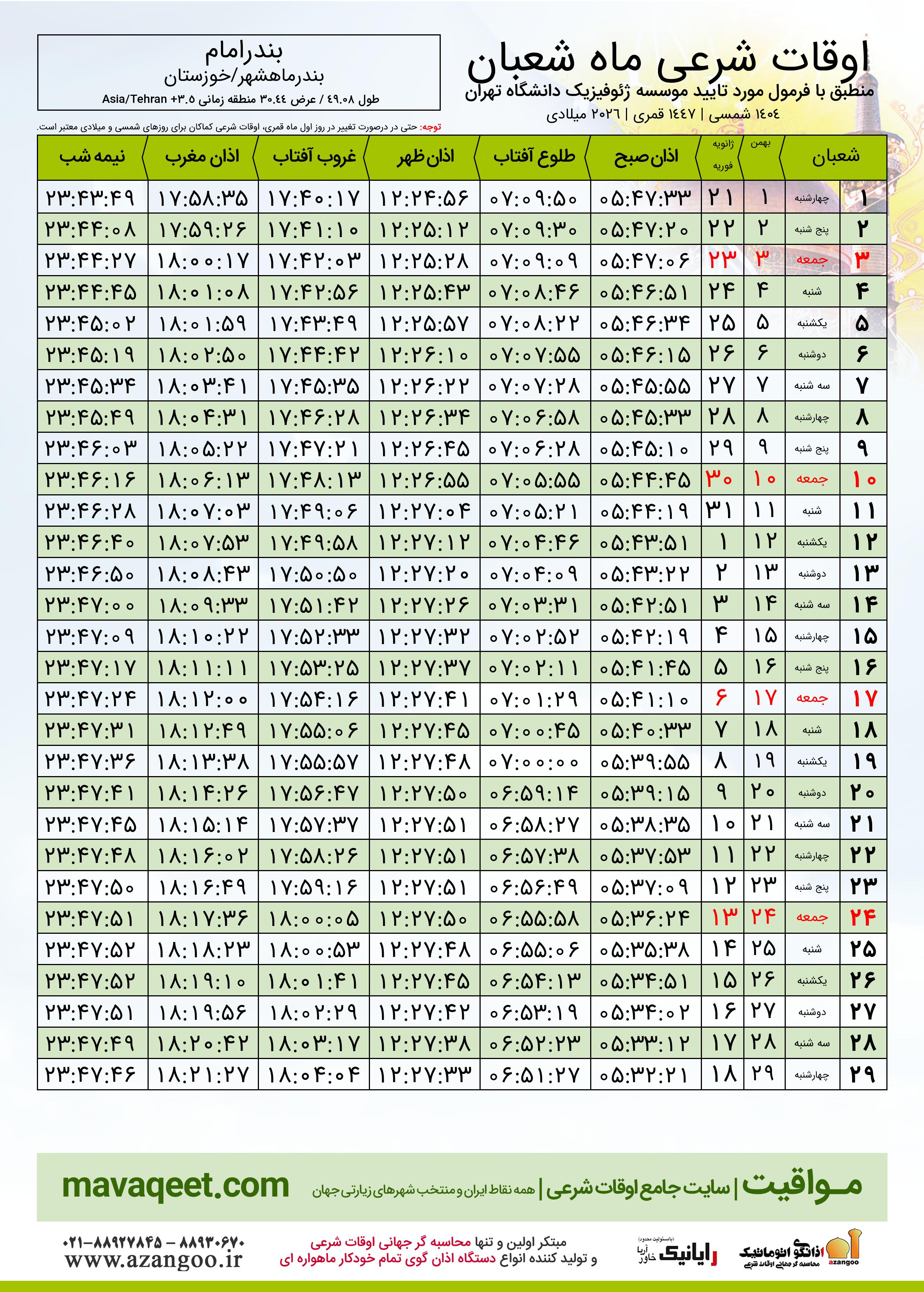 اوقات شرعی ماه شعبان ١٤٤٧ هـ.ق شهر بندرامام بر