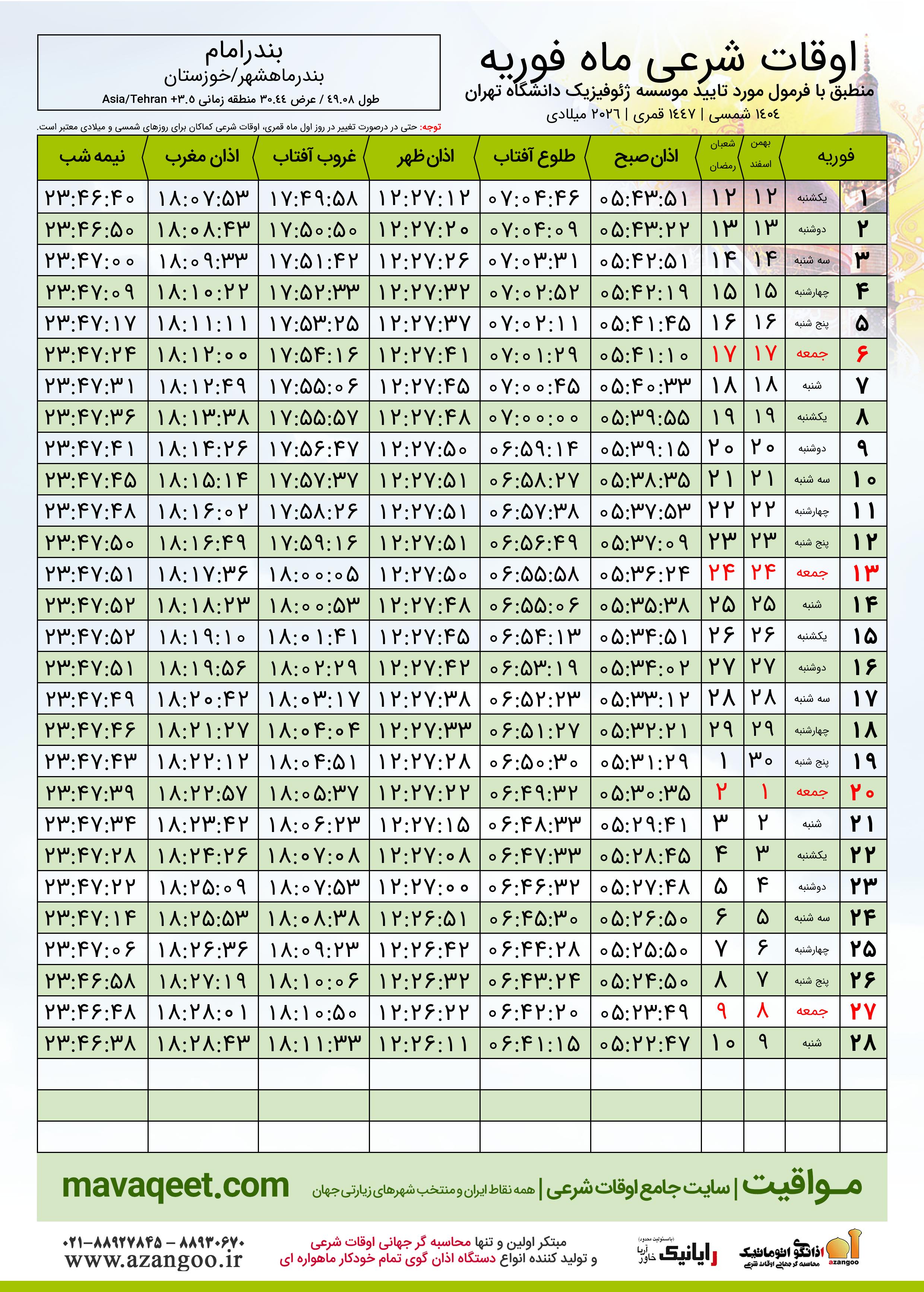 دانلود اوقات شرعی ماه رمضان ٠٤ - ١٤٠٤ شمسی | ٢٠٢٦ میلادی | ١٤٤٧ قمری شهر بندرامام