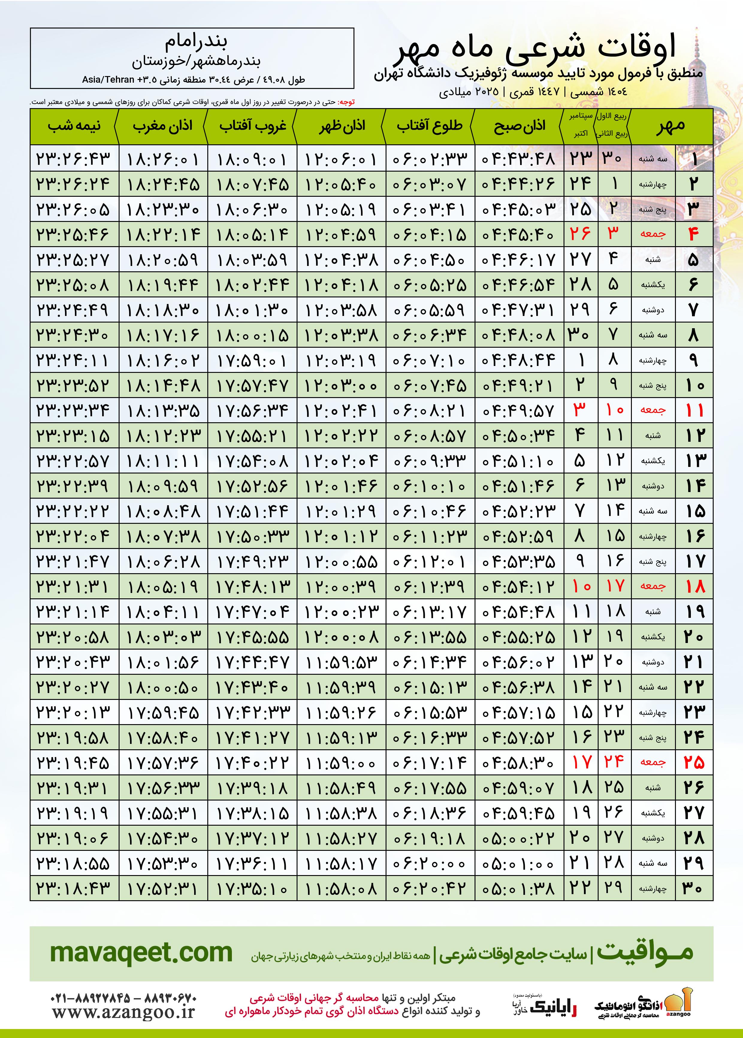 جدول اوقات شرعی مهر ١٤٠٤ شمسی شهر بندرامام
