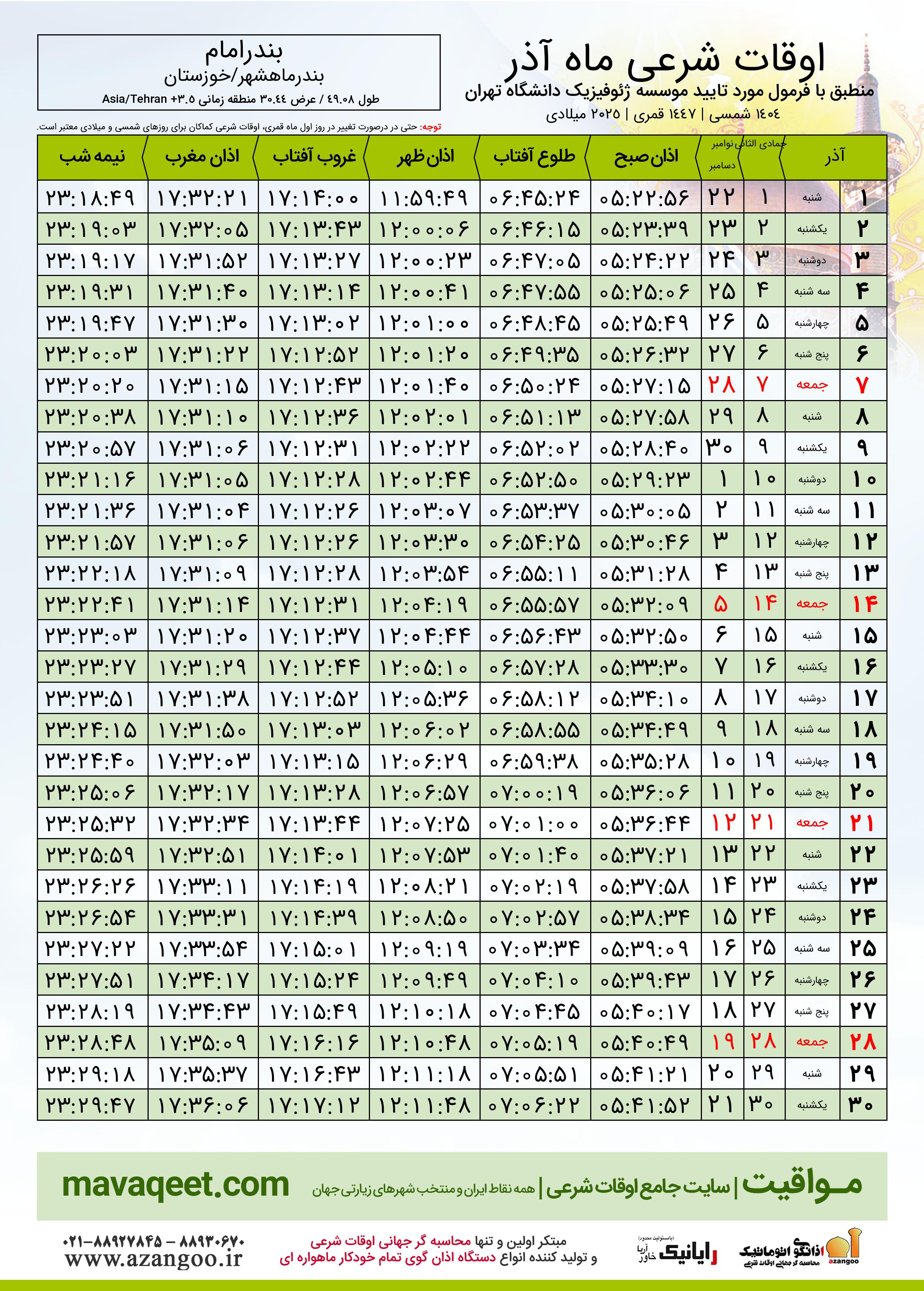 جدول اوقات شرعی آذر ١٤٠٤ شمسی شهر بندرامام