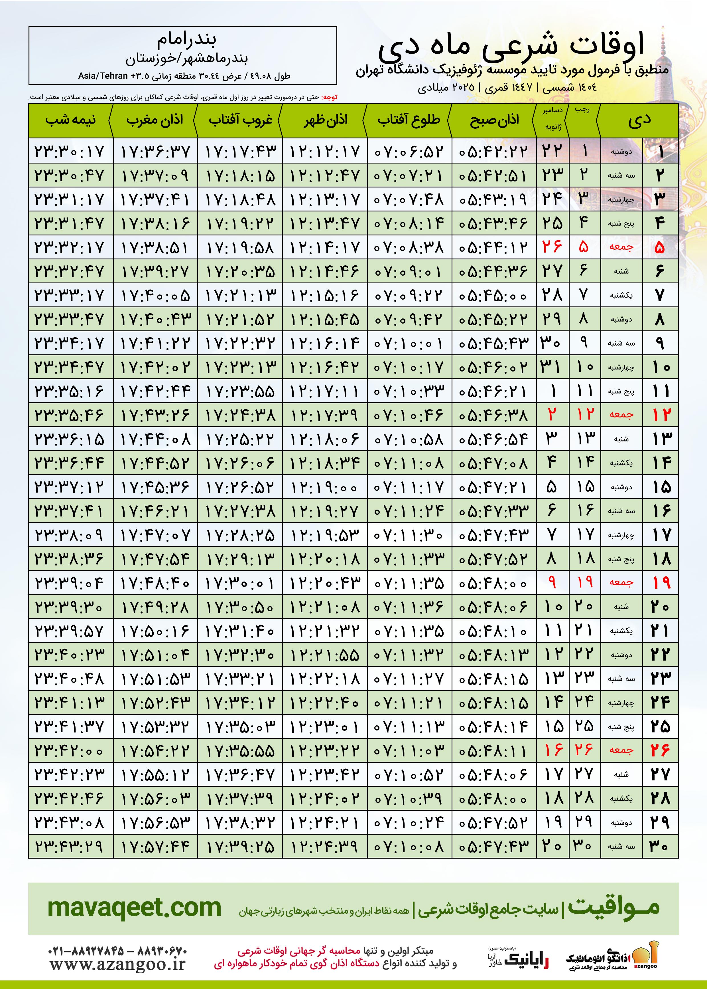 جدول اوقات شرعی دسامبر ٢٠٢٥ میلادی شهر بندرامام