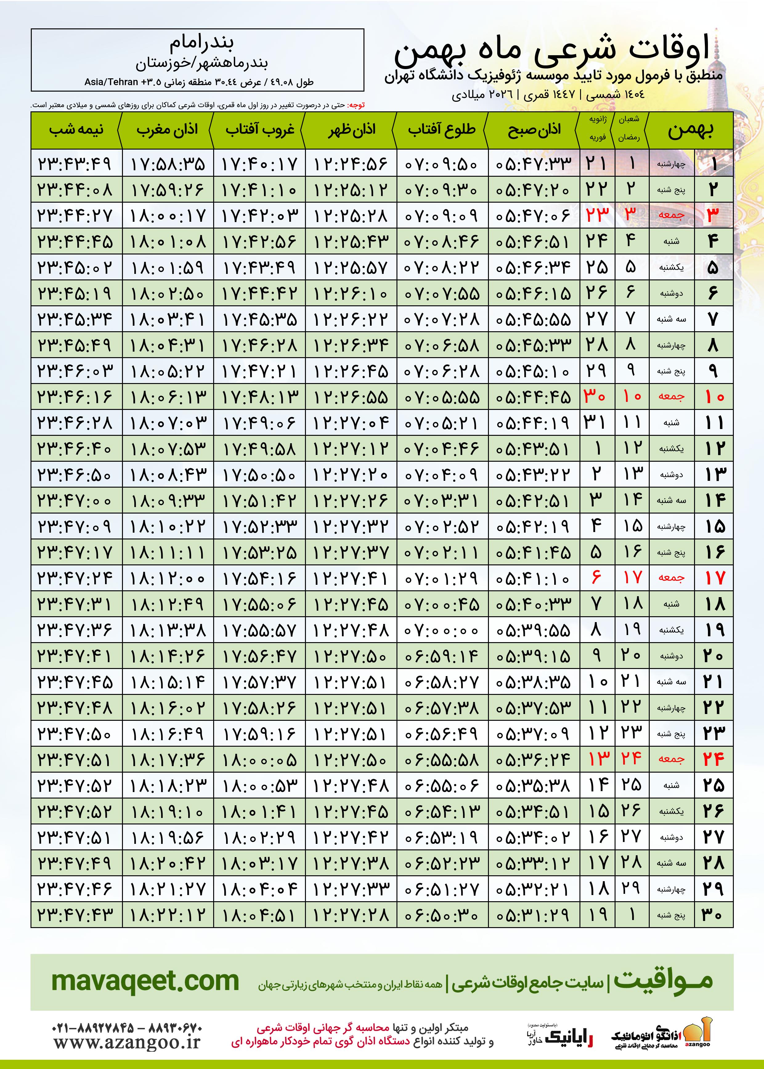 دانلود اوقات شرعی فوریه ٢٠٢٦ شهر بندرامام