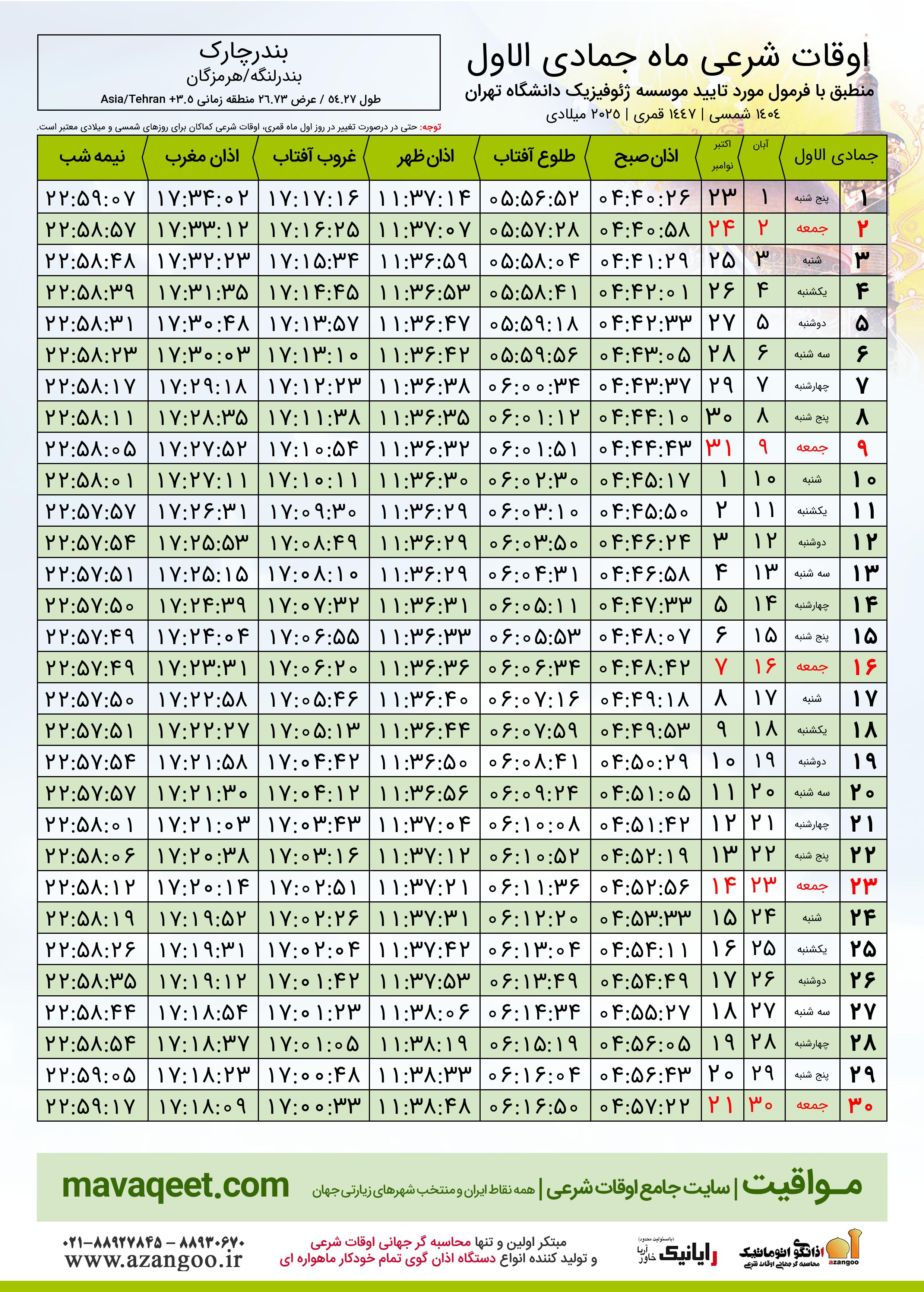 اوقات شرعی ماه جمادی الاول ١٤٤٧ هـ.ق شهر بندرچارک بر