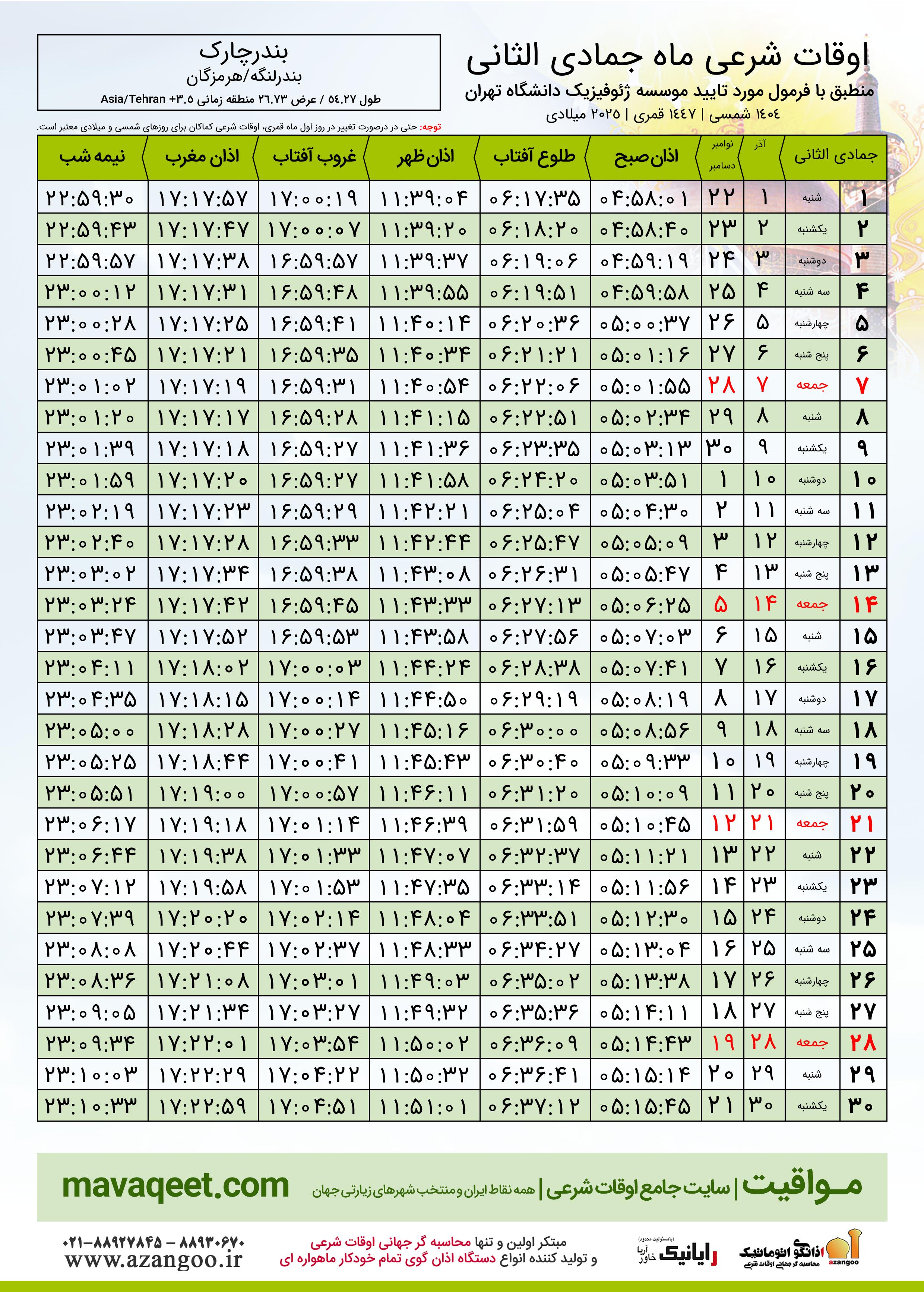 اوقات شرعی ماه جمادی الثانی ١٤٤٧ هـ.ق شهر بندرچارک بر