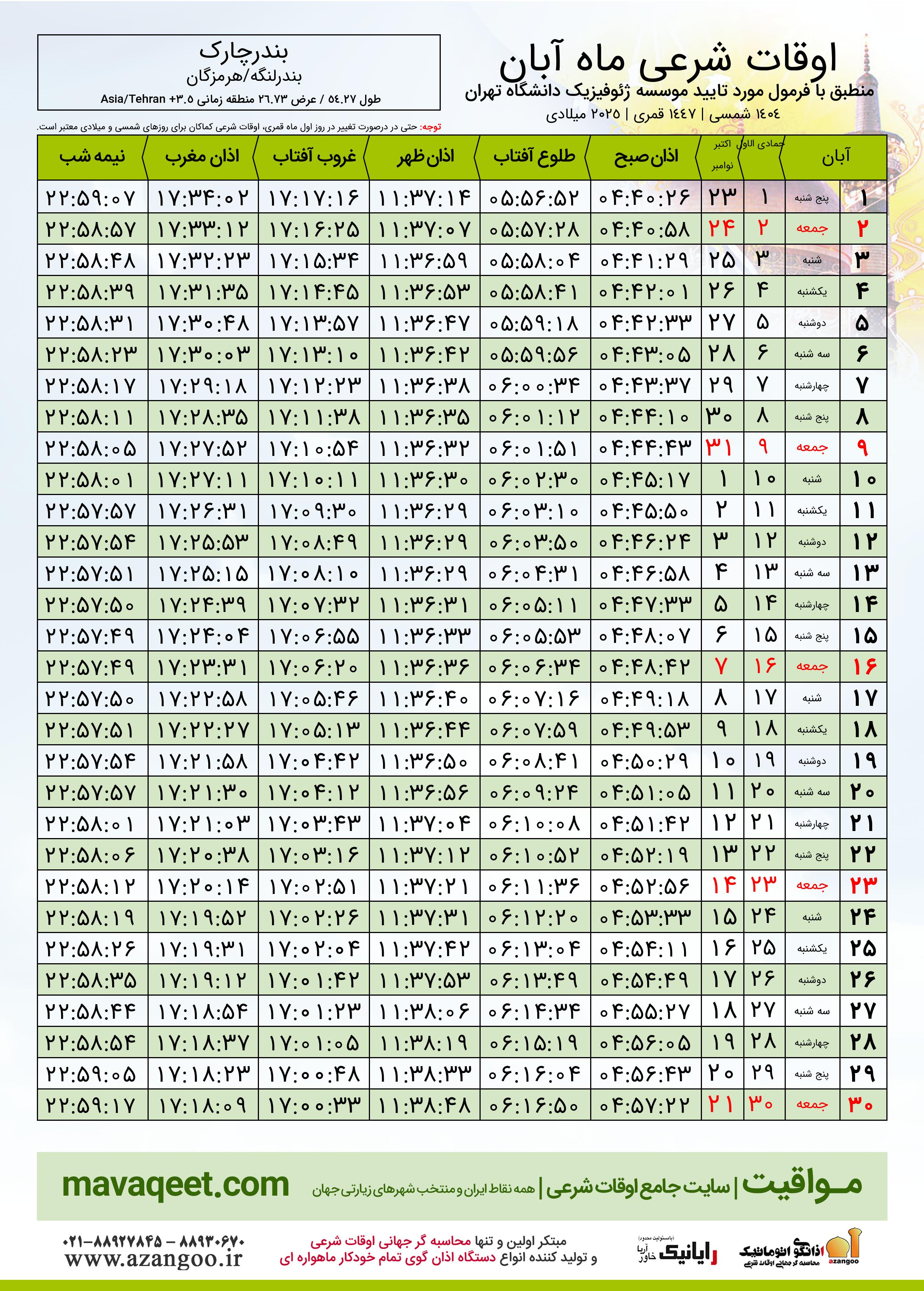 جدول اوقات شرعی آبان ١٤٠٤ شمسی شهر بندرچارک