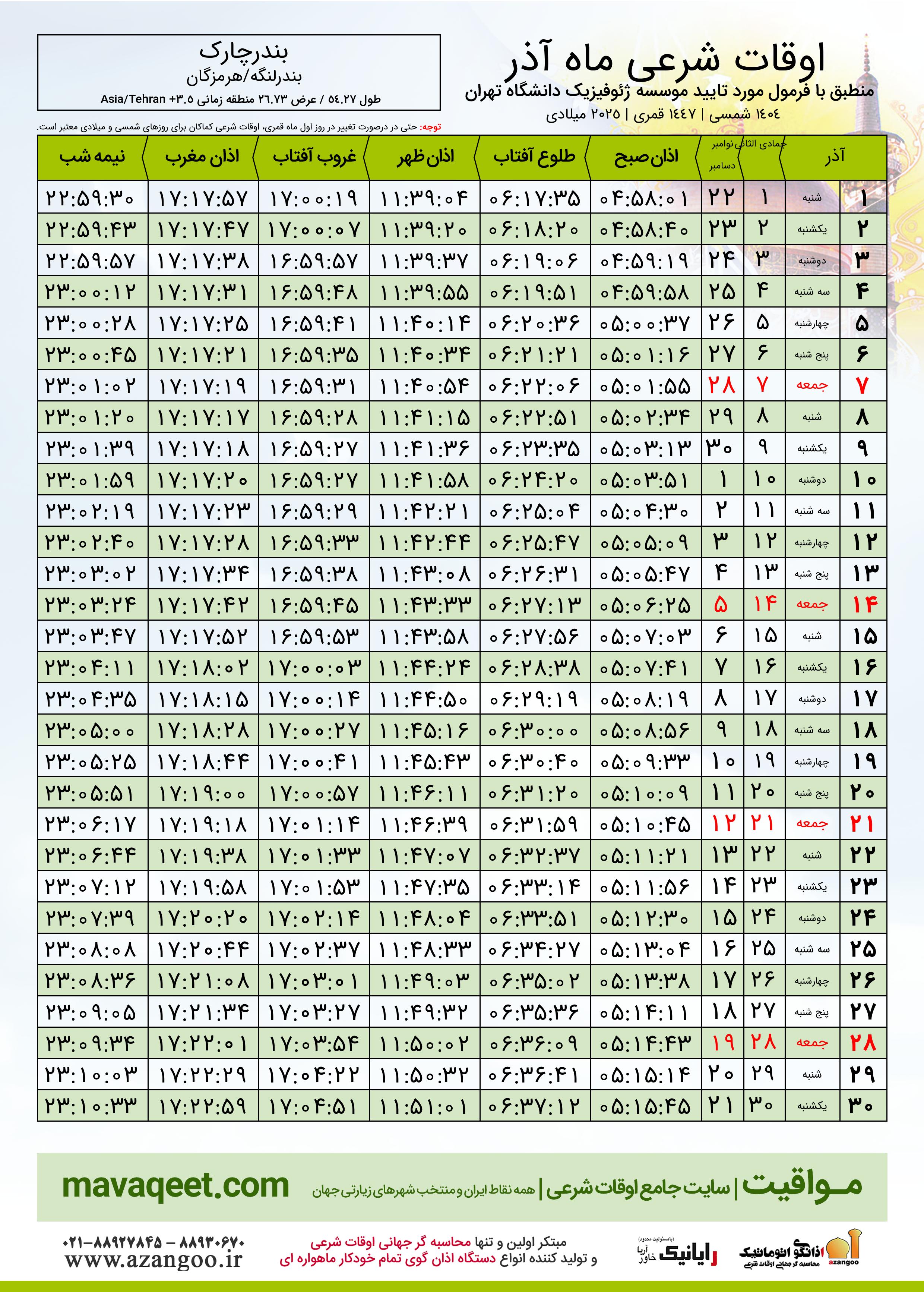 دانلود اوقات شرعی آذر ٠٤ - ١٤٠٤ شهر بندرچارک