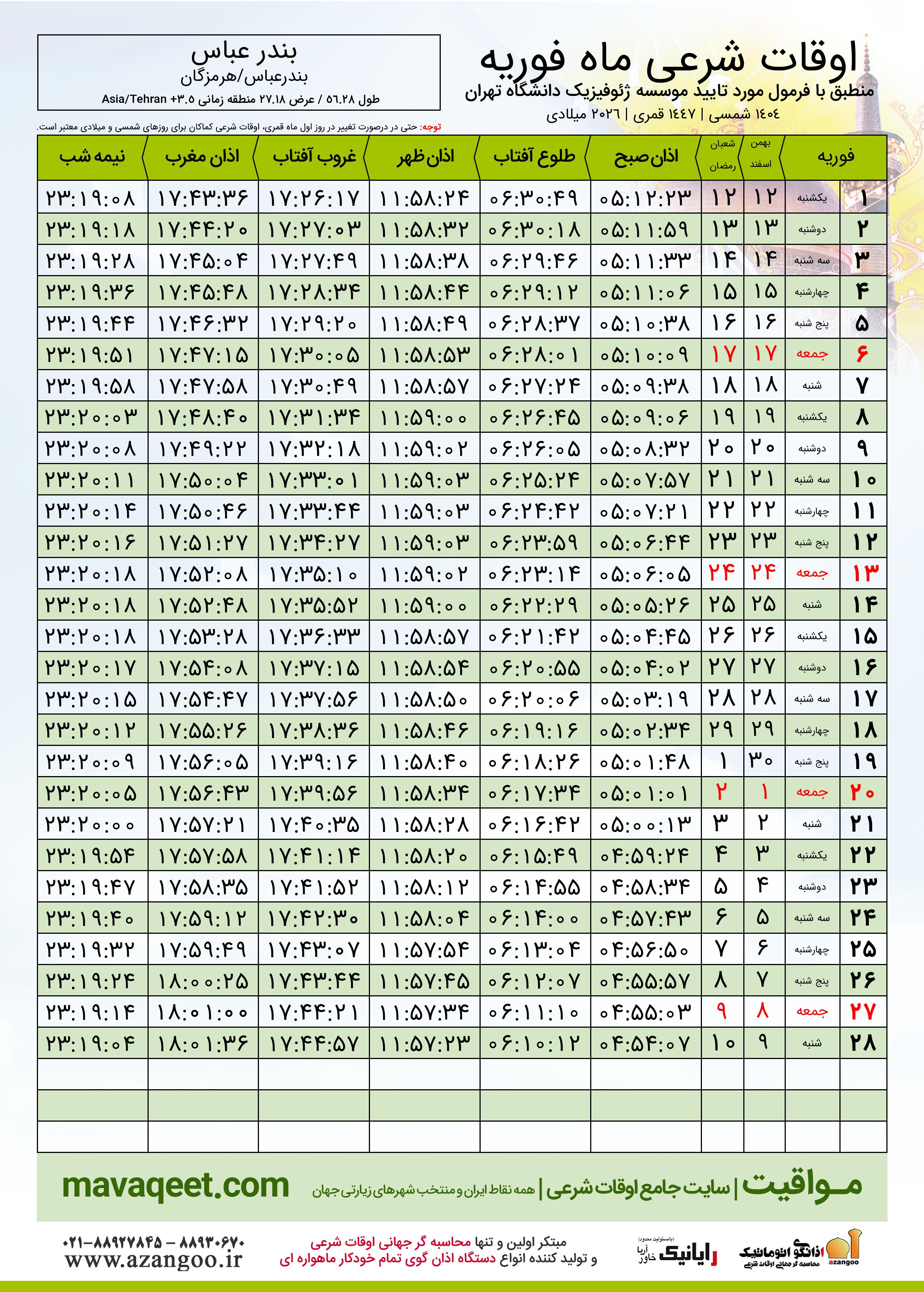 اوقات شرعی ماه شعبان ١٤٤٧ هـ.ق شهر بندر عباس بر