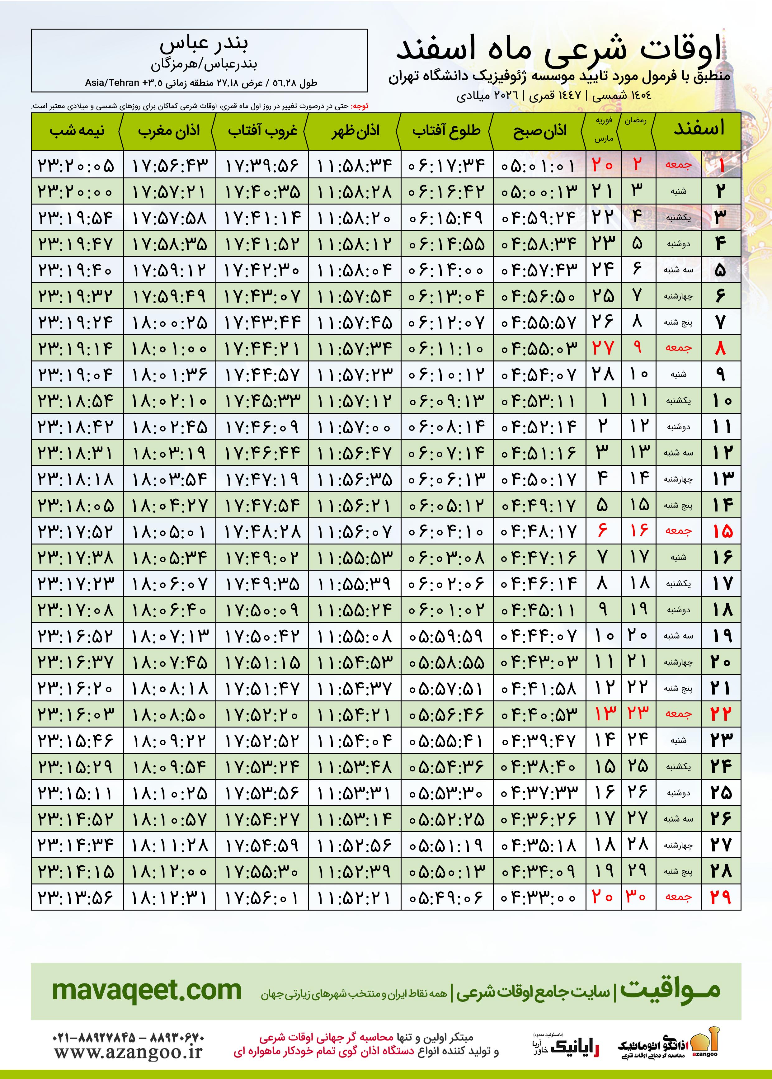 جدول اوقات شرعی ماه رمضان شهر بندر عباس ٠٤ - ١٤٠٤ شمسی | ٢٠٢٦ میلادی | ١٤٤٧ قمری