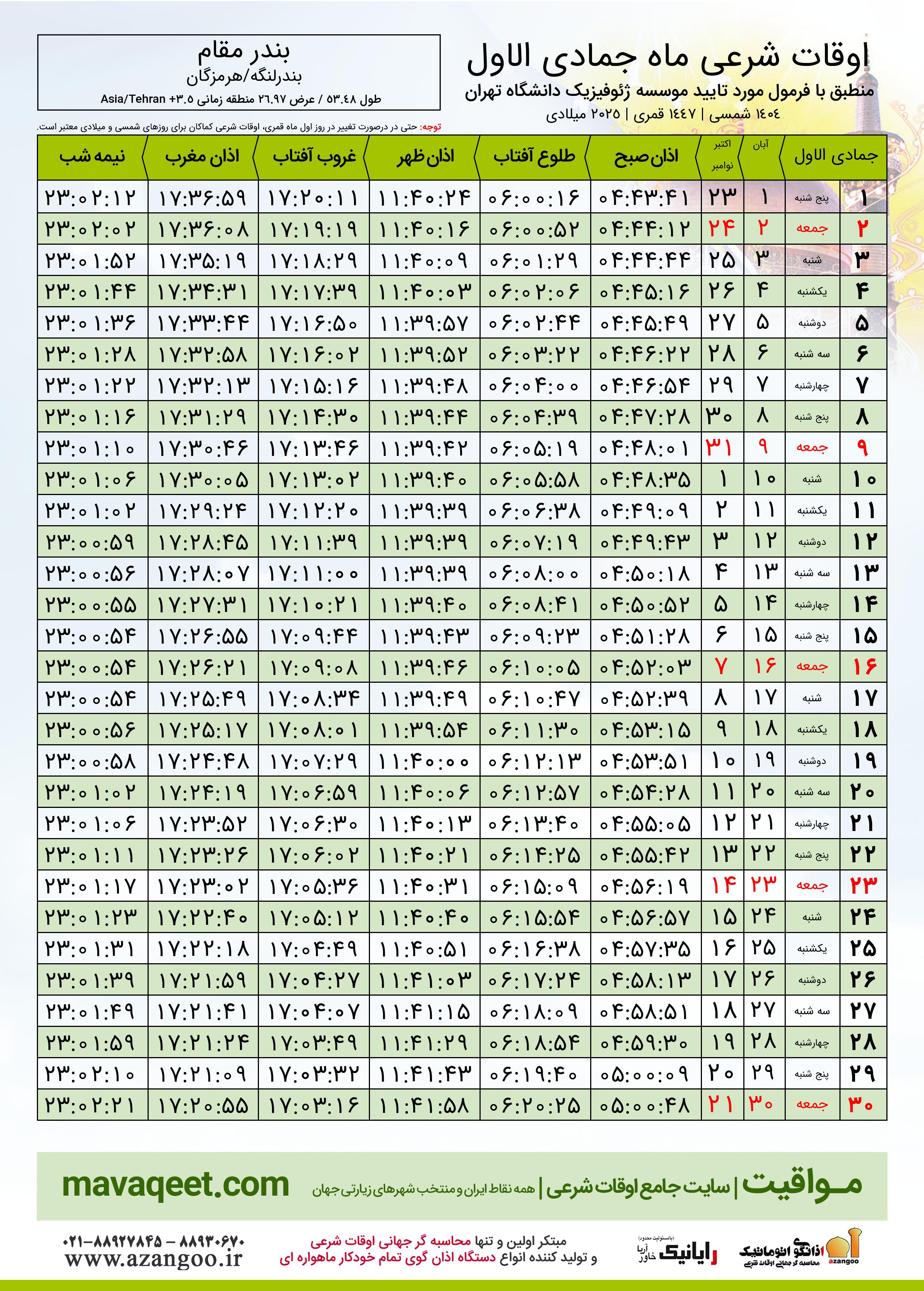 اوقات شرعی ماه جمادی الاول ١٤٤٧ هـ.ق شهر بندر مقام بر